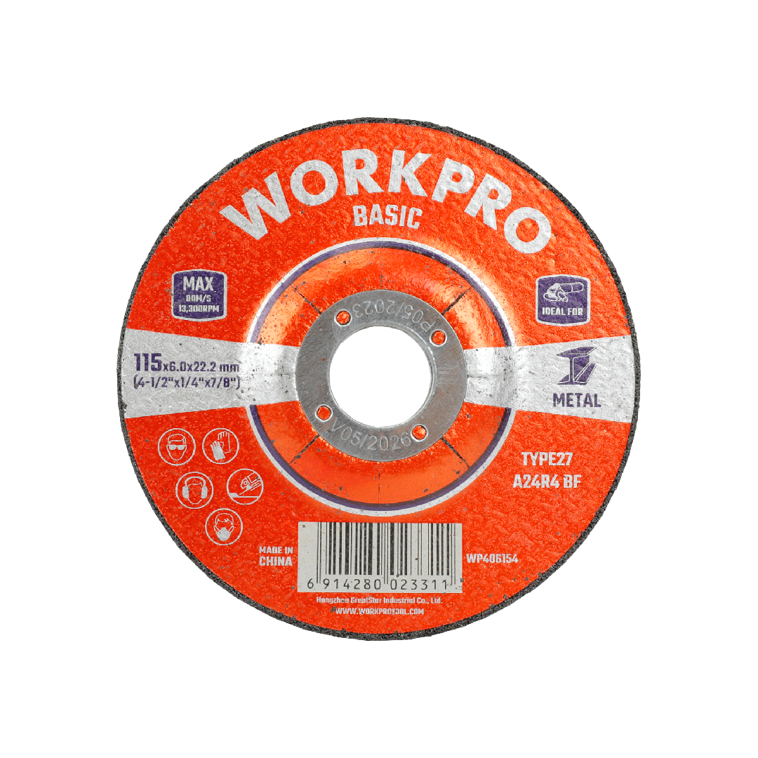 قرص جلخ معدني من WORKPRO — موديل WP406154، مخصص لجلخ وتنعيم المعادن، بمواصفات Basic/T27، وبأبعاد 115x6x22.2 مم، مصمم لأعمال الجلخ العامة وتشكيل الأسطح المعدنية بكفاءة وثبات.