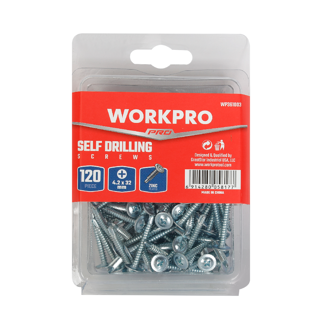 مسامير ذاتية الحفر عالية الجودة من WORKPRO — موديل WP361000، تأتي في عبوة تحتوي على 500 مسمار من نوع Self Drilling Screw برأس TRUSS Phillips ومطلية بالزنك لمقاومة الصدأ والتآكل. مقاس المسمار M4.2×19 مم مناسب للتثبيت الدقيق والسريع في المعادن والخشب الرقيق.
