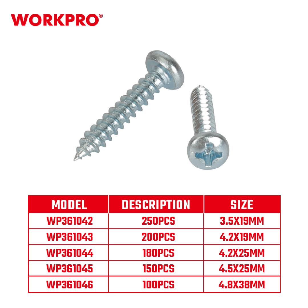 مسامير ذاتية الحفر عالية الجودة من WORKPRO — موديل WP361044، تأتي في عبوة تحتوي على 180 مسمار من نوع Self Drilling Screw برأس Pan Phillips، بمقاس 4.2×25 مم. توفر هذه المسامير تثبيتًا سريعًا وموثوقًا دون الحاجة للحفر المسبق، مع رأس Pan لتوزيع أفضل للضغط عند التثبيت.