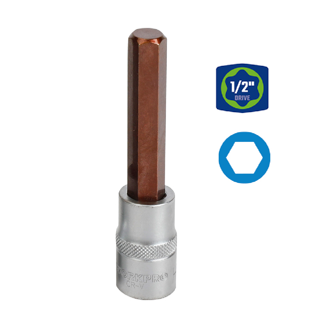بوكس الن مسدس Hex Bit طويل من WORKPRO موديل WP274218، بمقاس H10 ودرايف 1/2 إنش، وبطول يقارب 100 مم. مصمم للبراغي السداسية الكبيرة المستخدمة في المعدات الصناعية، الهياكل الميكانيكية الثقيلة، وأعمال الصيانة الاحترافية، مع قدرة عالية على تحمّل العزم القوي.