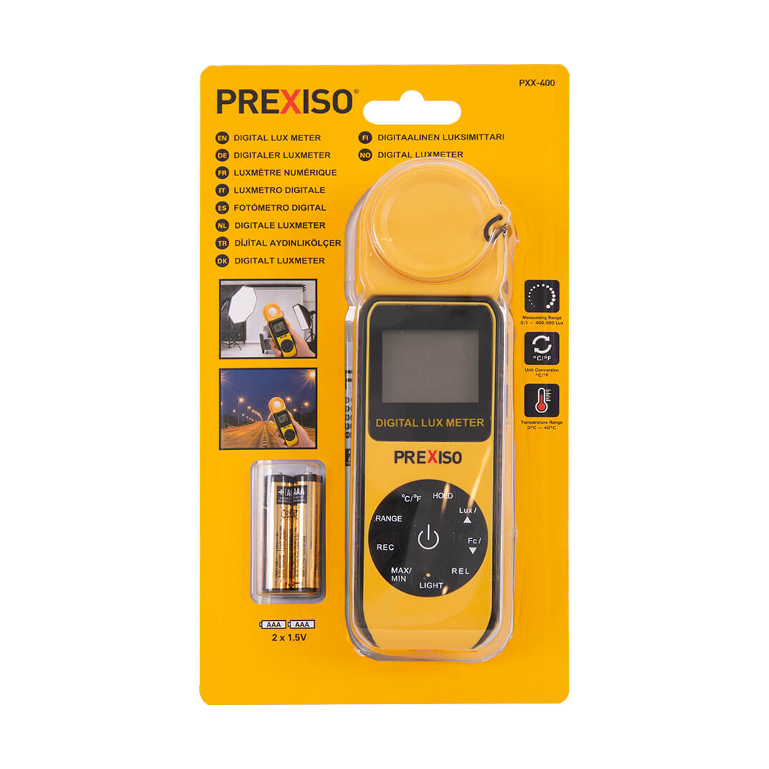 جهاز Prexiso Lux Meter هو أداة احترافية مصممة لقياس شدة الإضاءة بدقة عالية في مجموعة واسعة من التطبيقات، مثل التصوير الفوتوغرافي، المختبرات، الأعمال المعمارية، الهندسية، ومواقع البناء. يوفّر قراءات دقيقة وسهلة القراءة بفضل شاشته الرقمية الواضحة واستهلاكه المنخفض للطاقة.