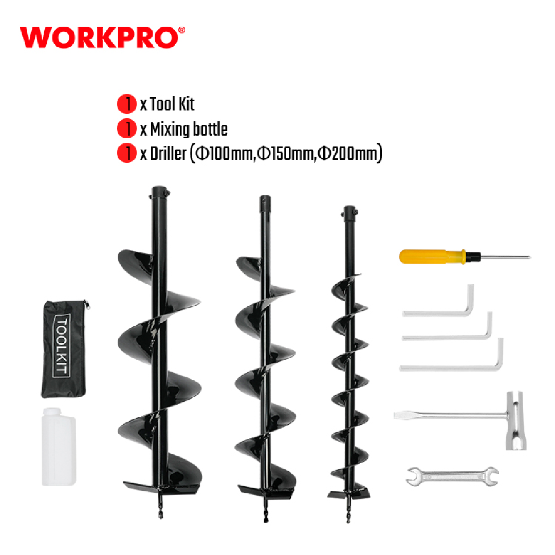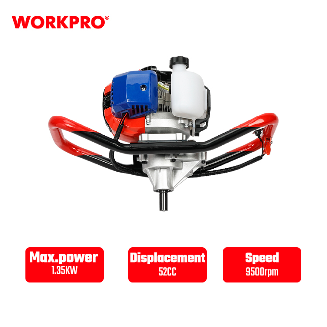 حفّار أرضي يعمل بالبنزين من WORKPRO موديل WP424006، مزوّد بمحرك ثنائي الشوط بسعة 52cc وقدرة تصل إلى 1.35 kW، مما يجعله مناسبًا لحفر التربة الزراعية ولأعمال تركيب الأعمدة والحدائق. مصمم ليمنح قوة دوران عالية وثبات أثناء الحفر، مع إمكانية تركيب لقم متنوعة لتلبية مختلف المتطلبات.