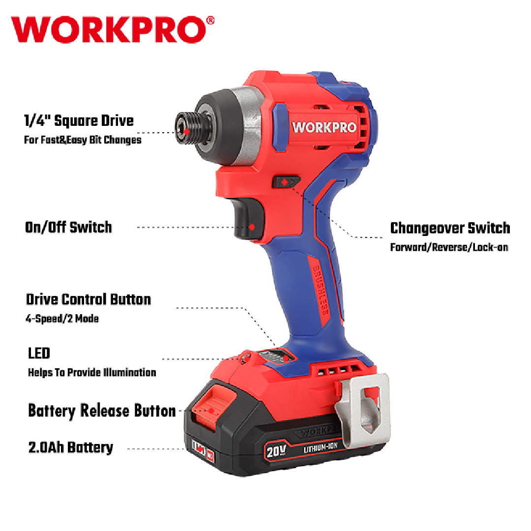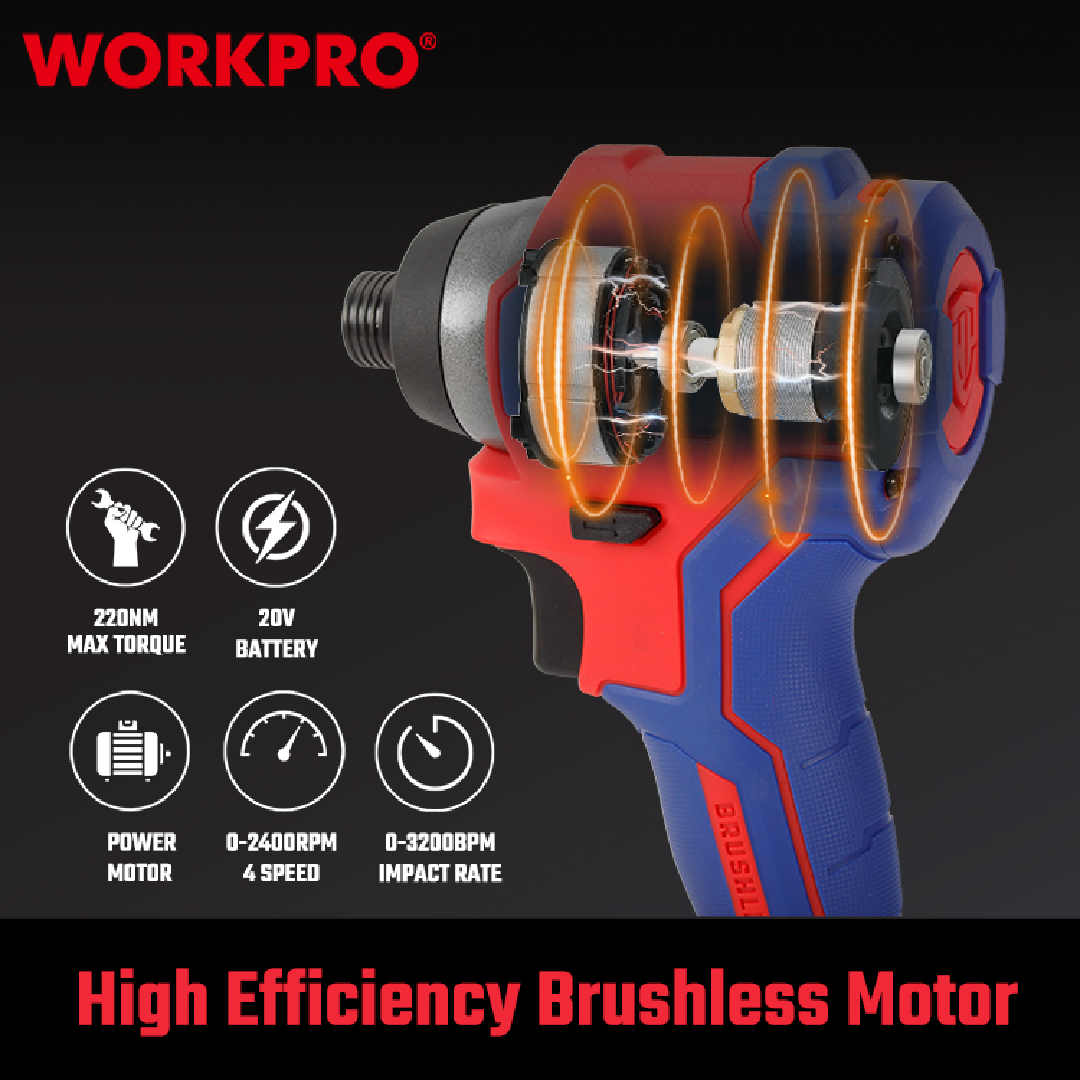 مفك صدمات لاسلكي احترافي من WORKPRO — موديل WP390102، يعمل بجهد 20V مع محرك Brushless بدون فحمات يوفر أداءً عاليًا وعمر تشغيل أطول وكفاءة ممتازة. يتميز بعزم شد قوي يصل إلى 220 نيوتن.متر وتحكم متعدد السرعات ليناسب مختلف أعمال التركيب والصيانة.