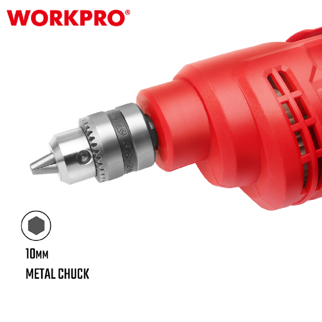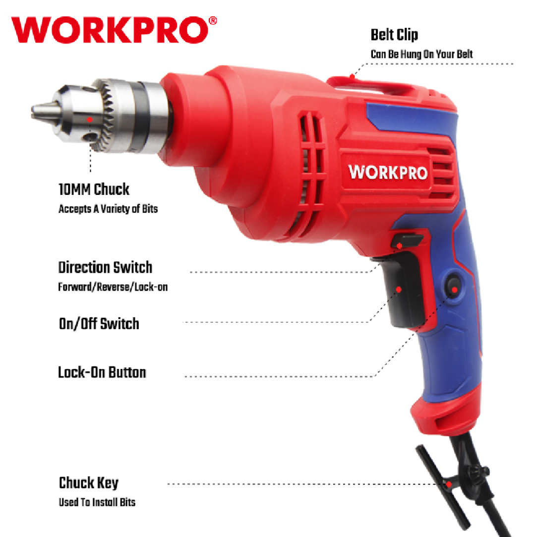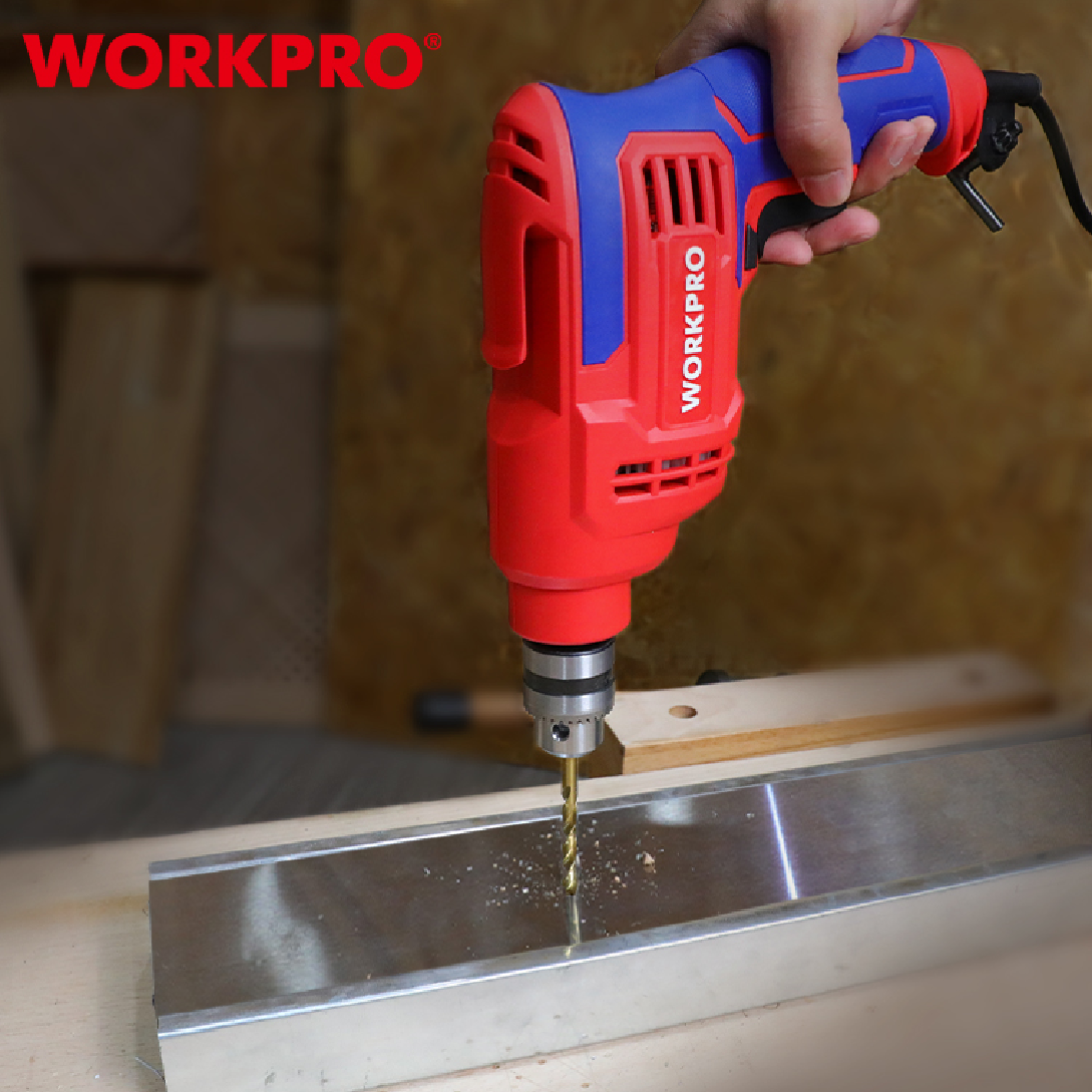 دريل احترافي من WORKPRO — موديل WP470000، مزوّد بظرف 10 مم، خفيف وسهل الاستخدام، مناسب لأعمال الحفر المتوسطة في الخشب، المعادن، البلاستيك ويعتبر مثاليًا لصيانة المنازل، الورش الصغيرة، وأعمال التركيب.