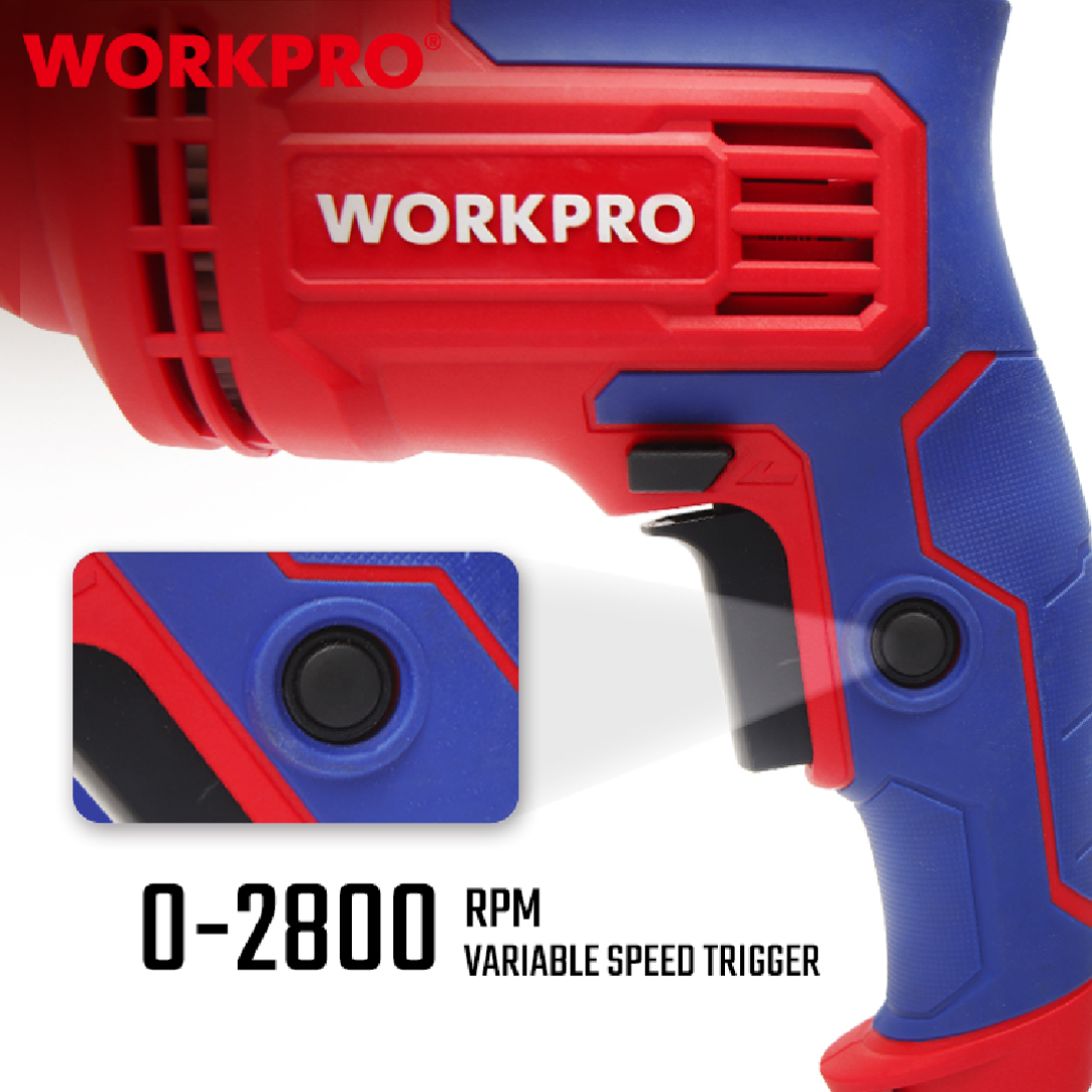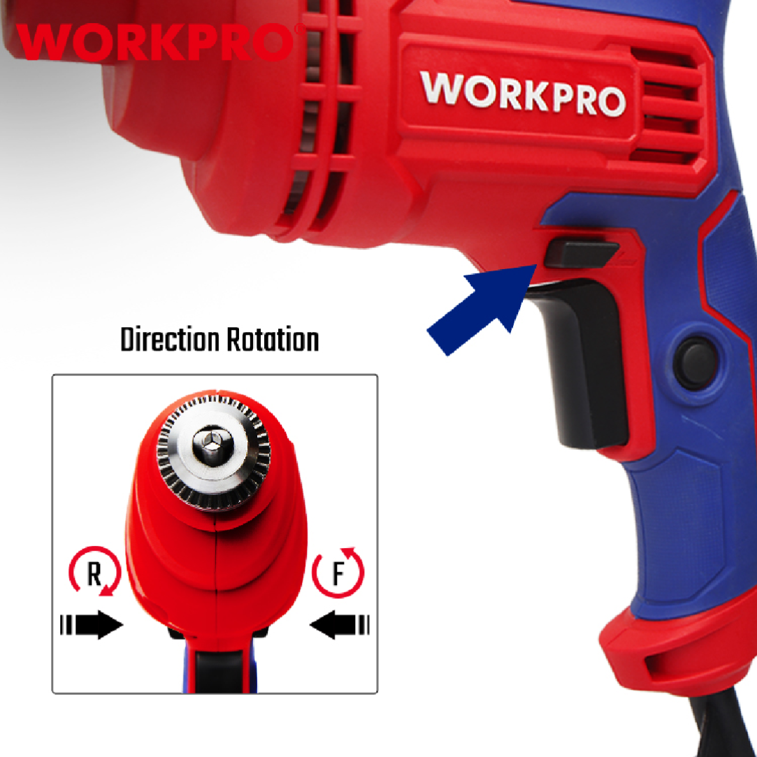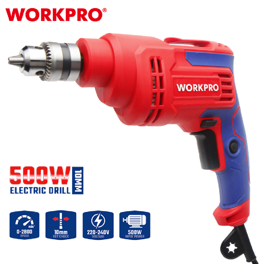 دريل احترافي من WORKPRO — موديل WP470000، مزوّد بظرف 10 مم، خفيف وسهل الاستخدام، مناسب لأعمال الحفر المتوسطة في الخشب، المعادن، البلاستيك ويعتبر مثاليًا لصيانة المنازل، الورش الصغيرة، وأعمال التركيب.