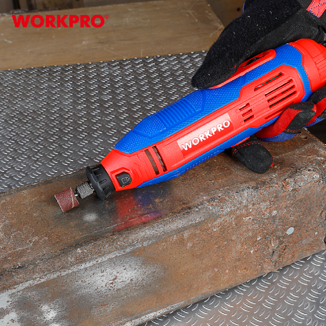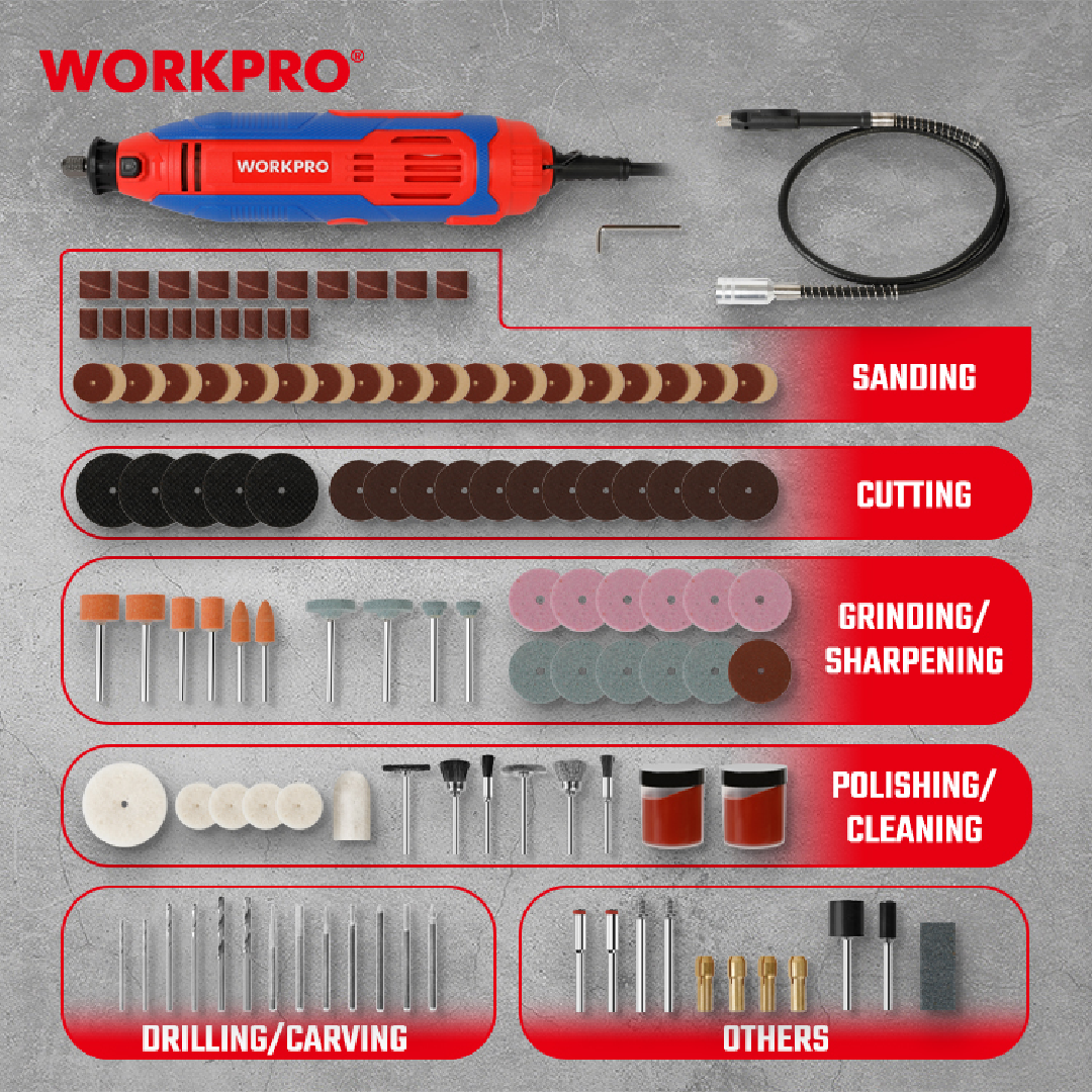 طقم ميني‑غرايندر كهربائي من WORKPRO — موديل WP472411CE (211 قطعة)، مناسب لأعمال الطحن، الصنفرة، التلميع، القطع، والعمل على الخشب، المعدن، البلاستيك، وغيرها.
