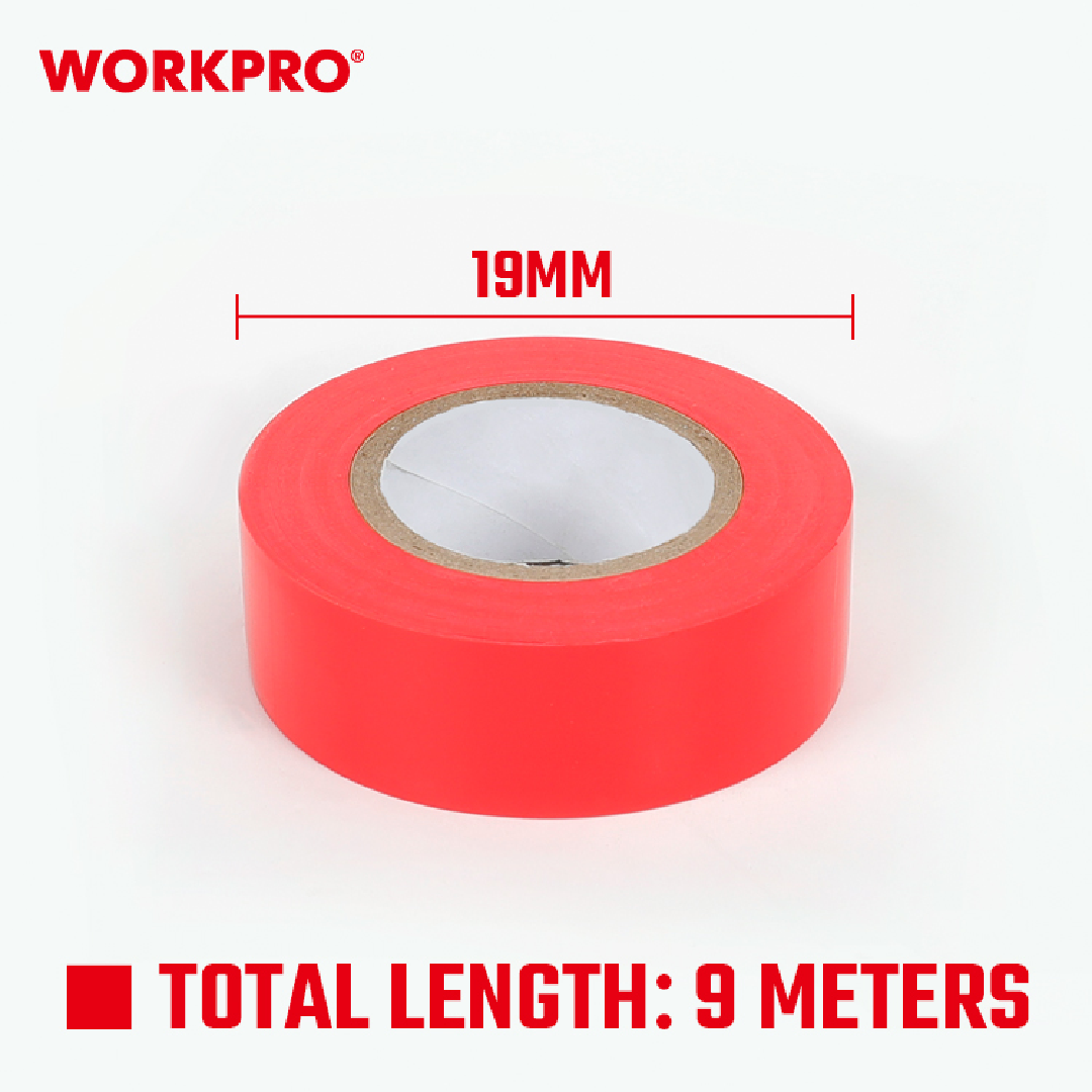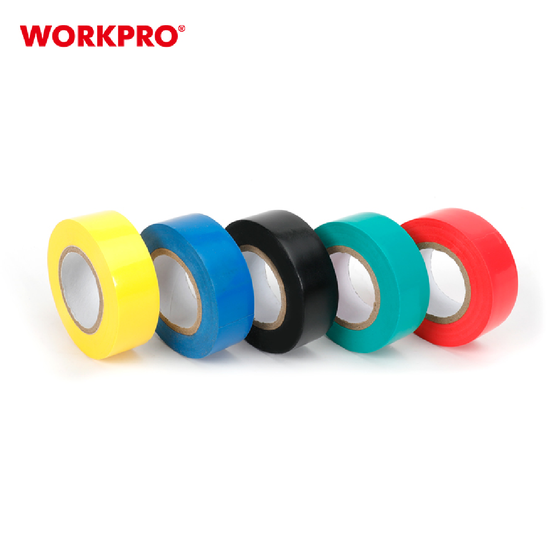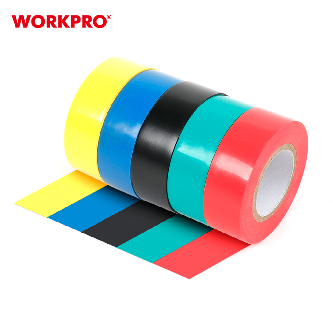 شريط عزل كهربائي عالي الجودة من WORKPRO — موديل WP296001، يأتي في عبوة تحتوي على 5 لفات بألوان متعددة، ويُستخدم لعزل الأسلاك الكهربائية وتثبيت الوصلات بأمان في الأعمال المنزلية والمهنية.