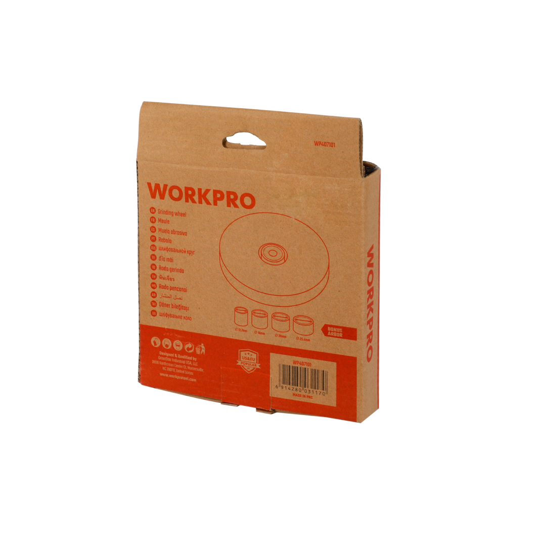 حجر جلخ مخصص لماكينات الجلخ الثابتة من WORKPRO — موديل WP407101، مصنوع من أكسيد الألومنيوم عالي الجودة، بمقاس 150 × 20 × 32 مم ودرجة خشونة 60G، مصمم لأعمال الشحذ والجلخ العامة للمعادن والأدوات.