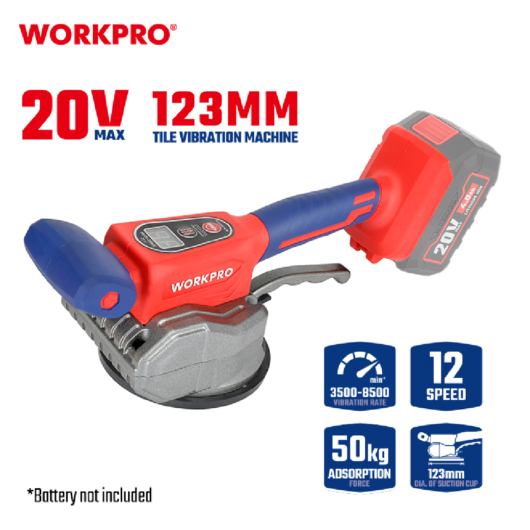 آلة هزاز وتركيب السيراميك اللاسلكية من ورك برو (WORKPRO) – بجهد 20 فولت – موديل WP397018 – هي الأداة المبتكرة التي يحتاجها كل فني تبليط لضمان تركيب مثالي وخالٍ من الفراغات الهوائية. تجمع هذه الآلة بين قوة الامتصاص العالية والاهتزازات القابلة للضبط، مما يسهل عملية رص وتثبيت البلاط والسيراميك والبورسلين بدقة وسرعة فائقة.
