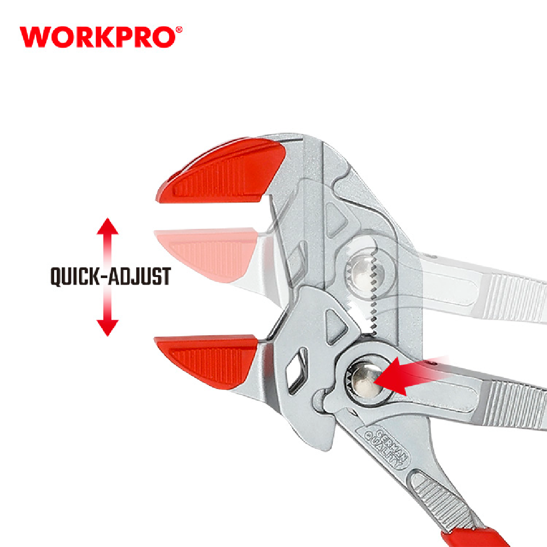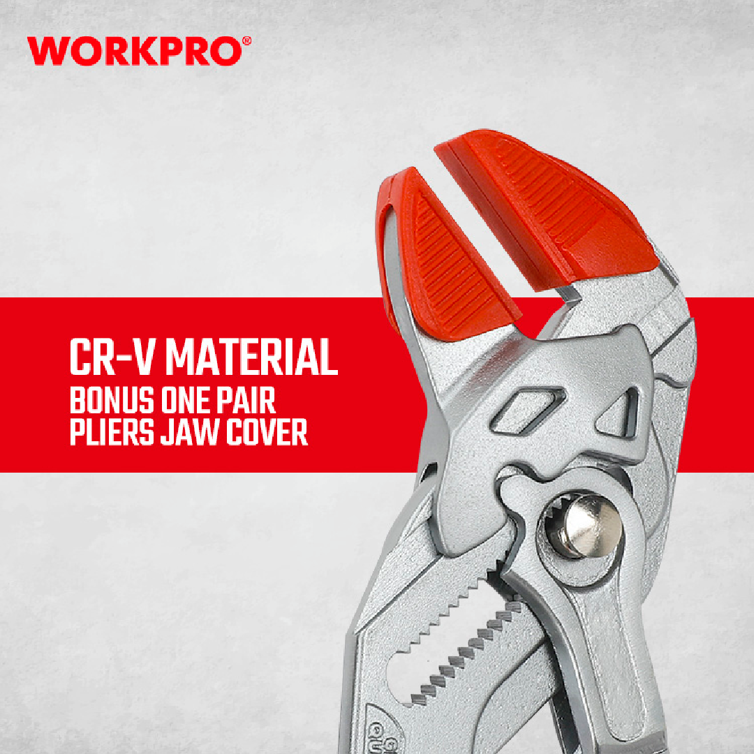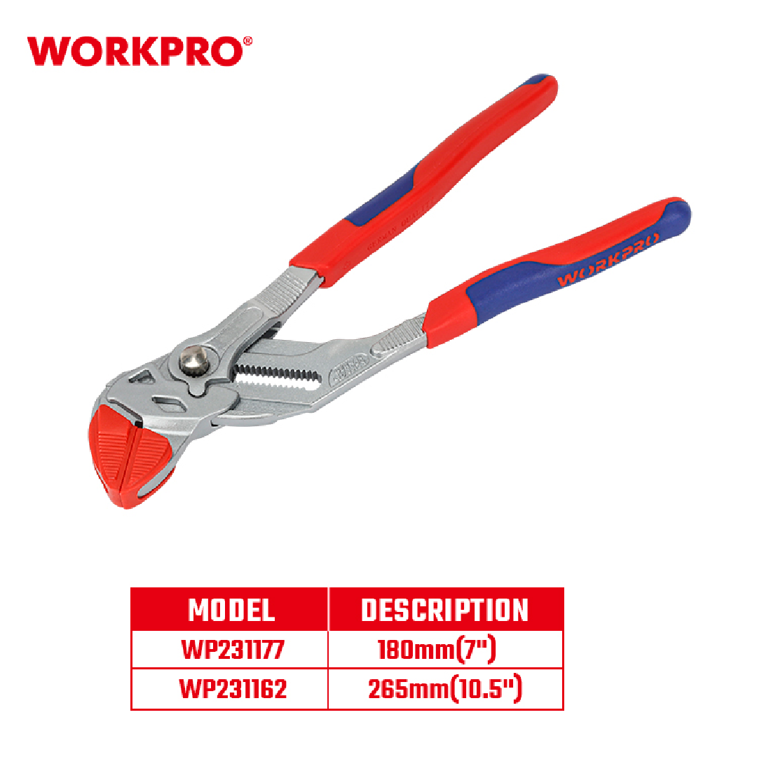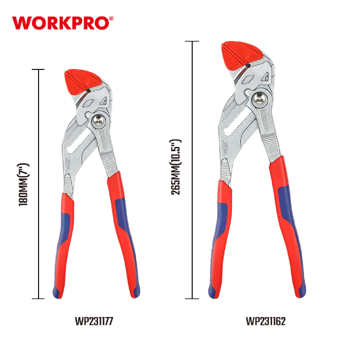 زرادية فورد مواصفات خاصة 10.5 انش من وورك برو تم تصميم كماشة الوصلات WORKPRO WP231162للتطبيقات المتنوعة. مصنوعة من فولاذ الكروم والفاناديوم المتين (CR-V)، وتتميز بآلية ضبط سريعة وفكين على شكل حرف V يحملان بشكل آمن الأشياء المستديرة والمسطحة والمربعة والسداسية. المقبض المريح مغطى بمطاط TPR، مما يوفر قبضة مريحة وثابتة أثناء الاستخدام.