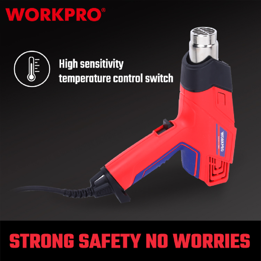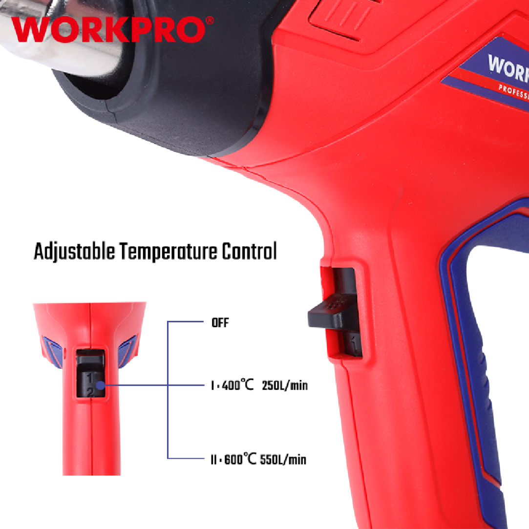 مسدس هواء حراري احترافي من WORKPRO — موديل WP474000 بقدرة 2000W، مناسب لمجموعة واسعة من الأعمال مثل إزالة الطلاء، تشكيل البلاستيك، الانكماش الحراري، تجفيف المواد، ولحام خفيف للمواد البلاستيكية.