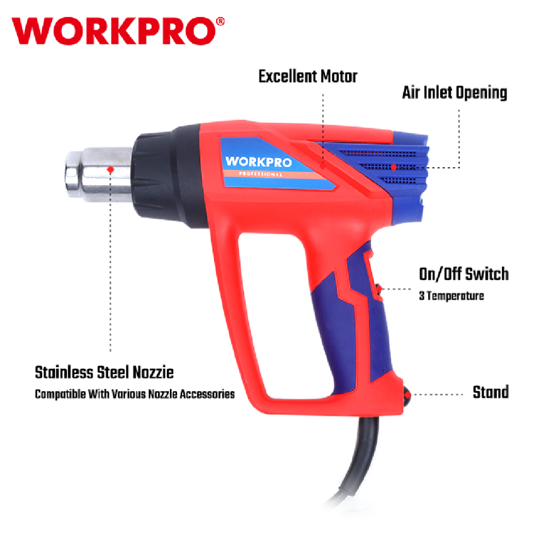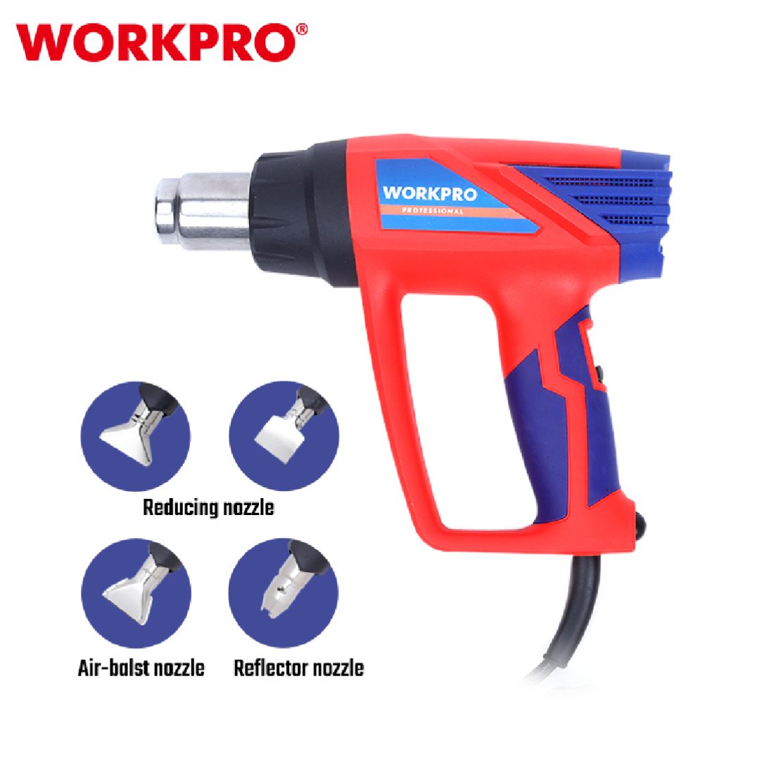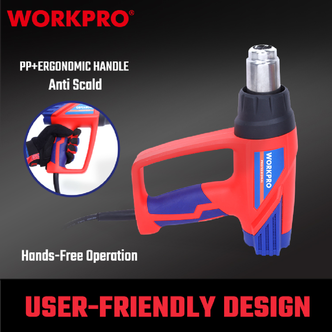 مسدس هواء حراري صناعي عالي القدرة من WORKPRO — موديل WP474001 بقدرة 2000W، مصمم للأعمال الثقيلة مثل إزالة الطلاء، تشكيل البلاستيك، الانكماش الحراري، التسخين السريع، والمهام الصناعية داخل الورش والبناء.