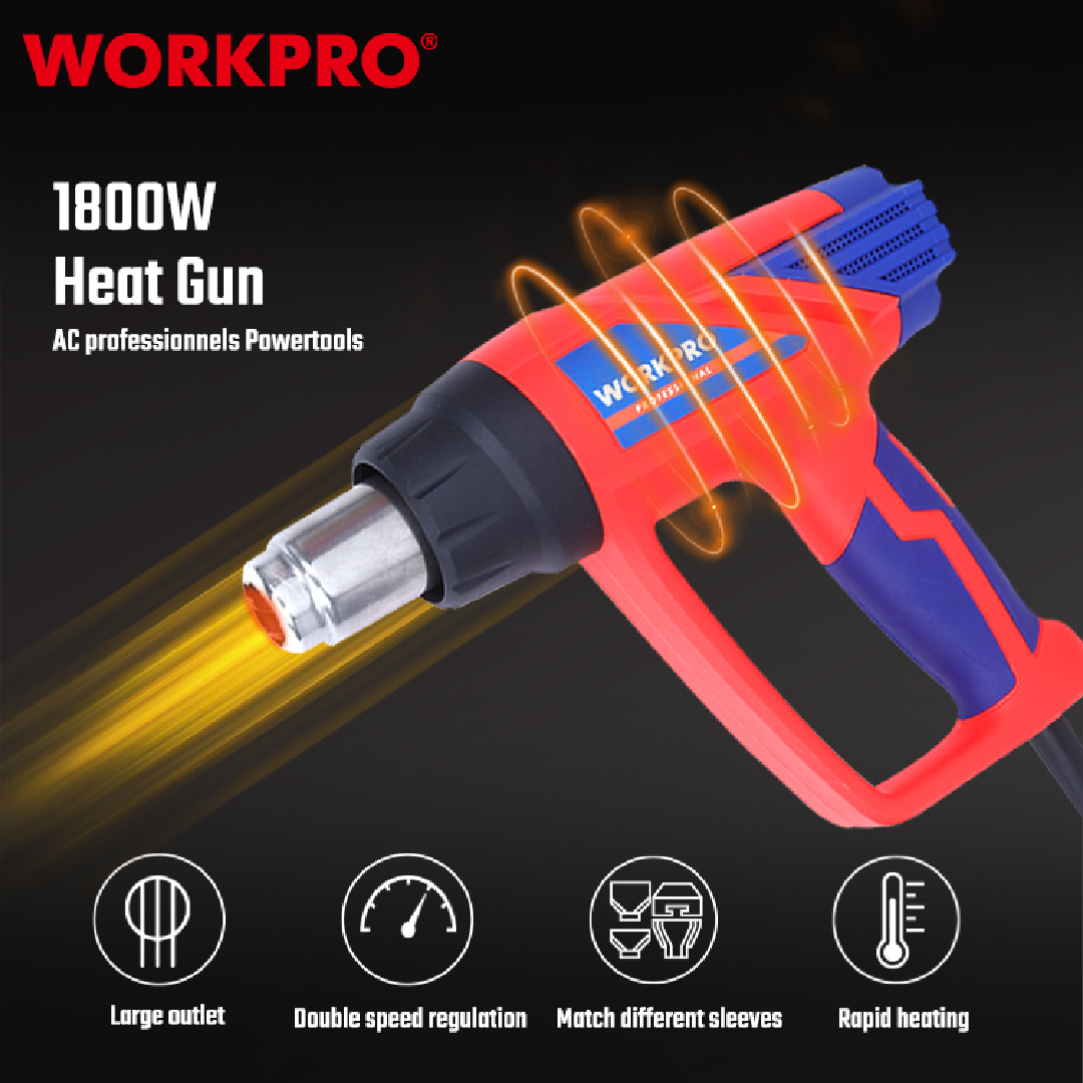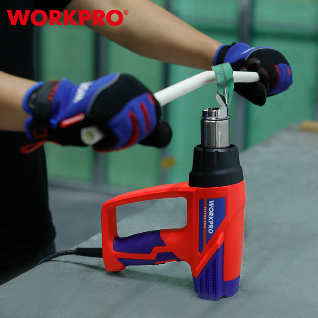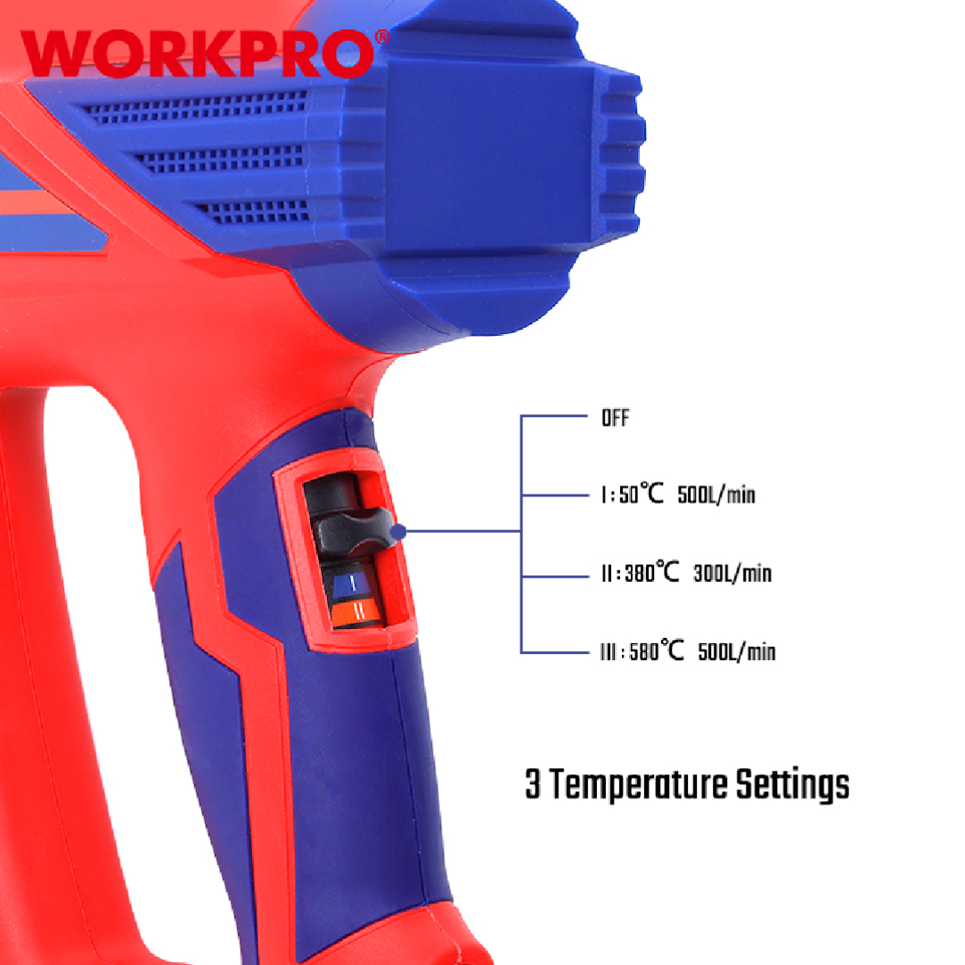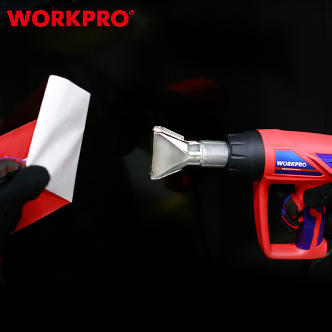 مسدس هواء حراري صناعي عالي القدرة من WORKPRO — موديل WP474001 بقدرة 2000W، مصمم للأعمال الثقيلة مثل إزالة الطلاء، تشكيل البلاستيك، الانكماش الحراري، التسخين السريع، والمهام الصناعية داخل الورش والبناء.