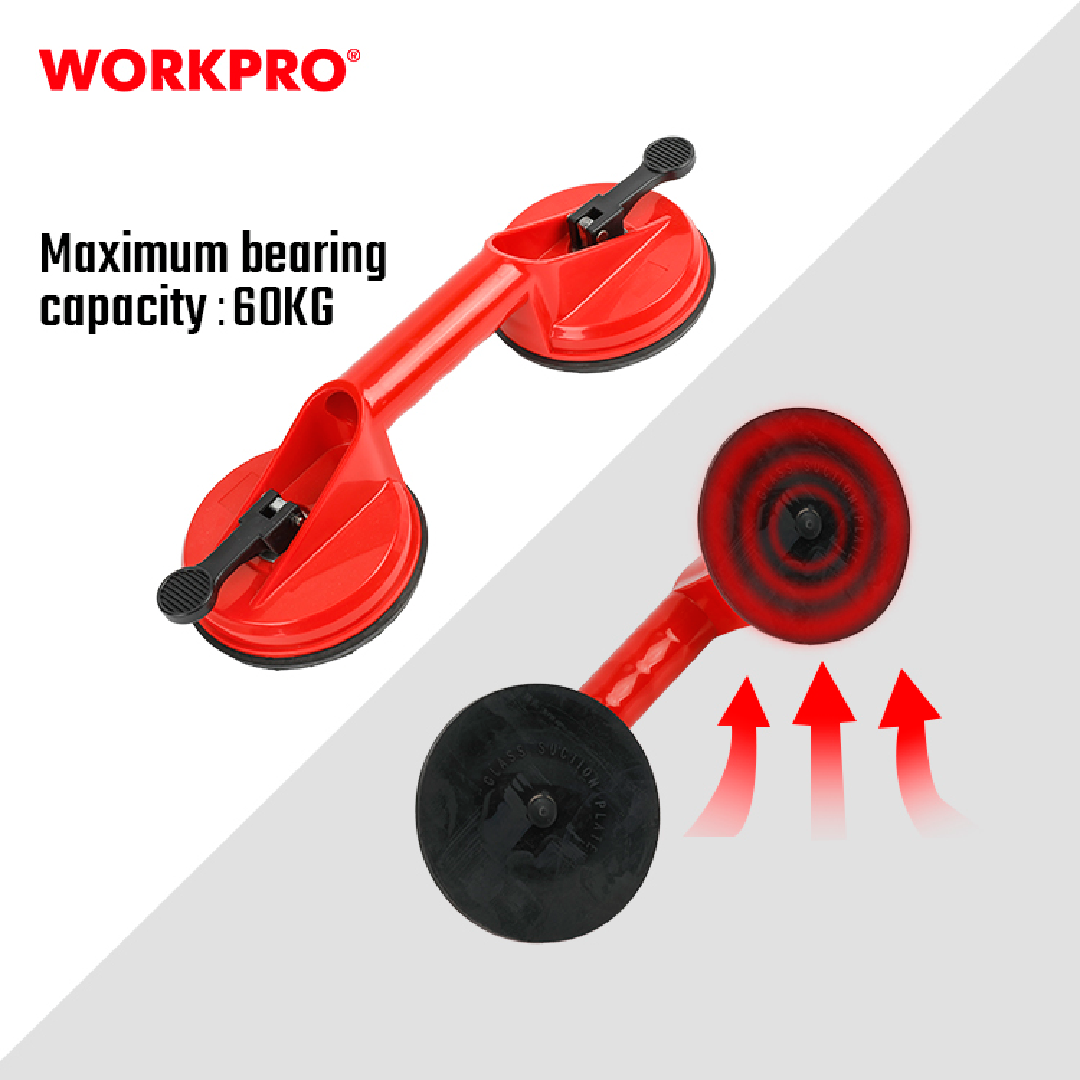 كوب شفط مزدوج عملي مصنوع من البلاستيك من WORKPRO — موديل WP329003، مصمم لرفع وحمل الزجاج، البلاط، والسيراميك والأسطح الملساء بثبات وأمان، ويُعد خيارًا خفيف الوزن وسهل الاستخدام لأعمال التركيب اليومية.