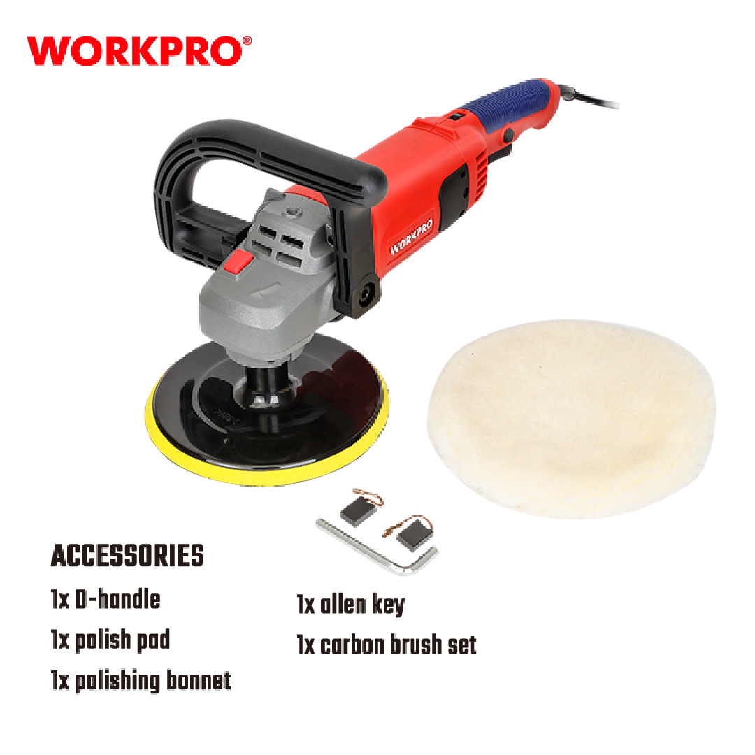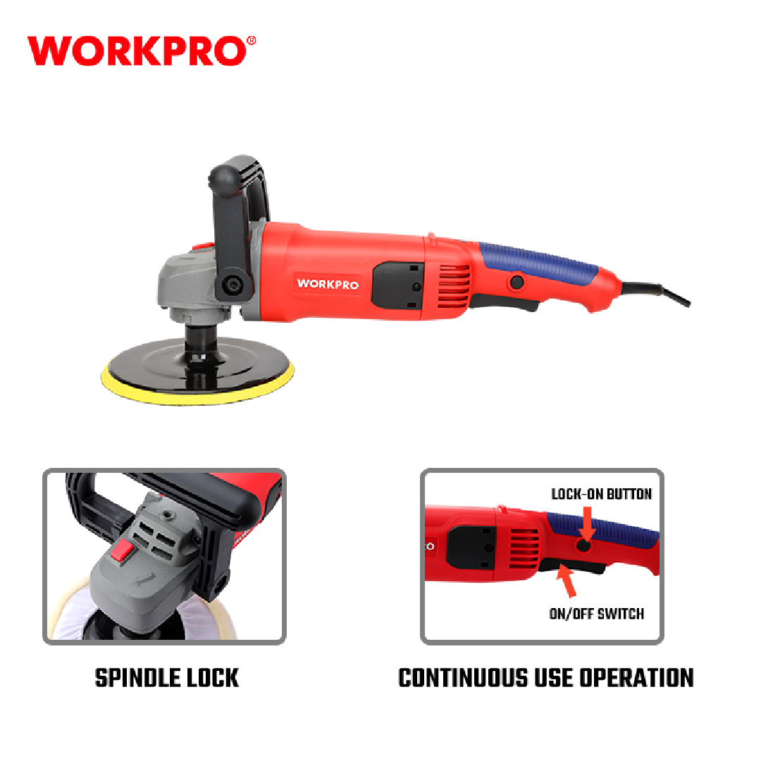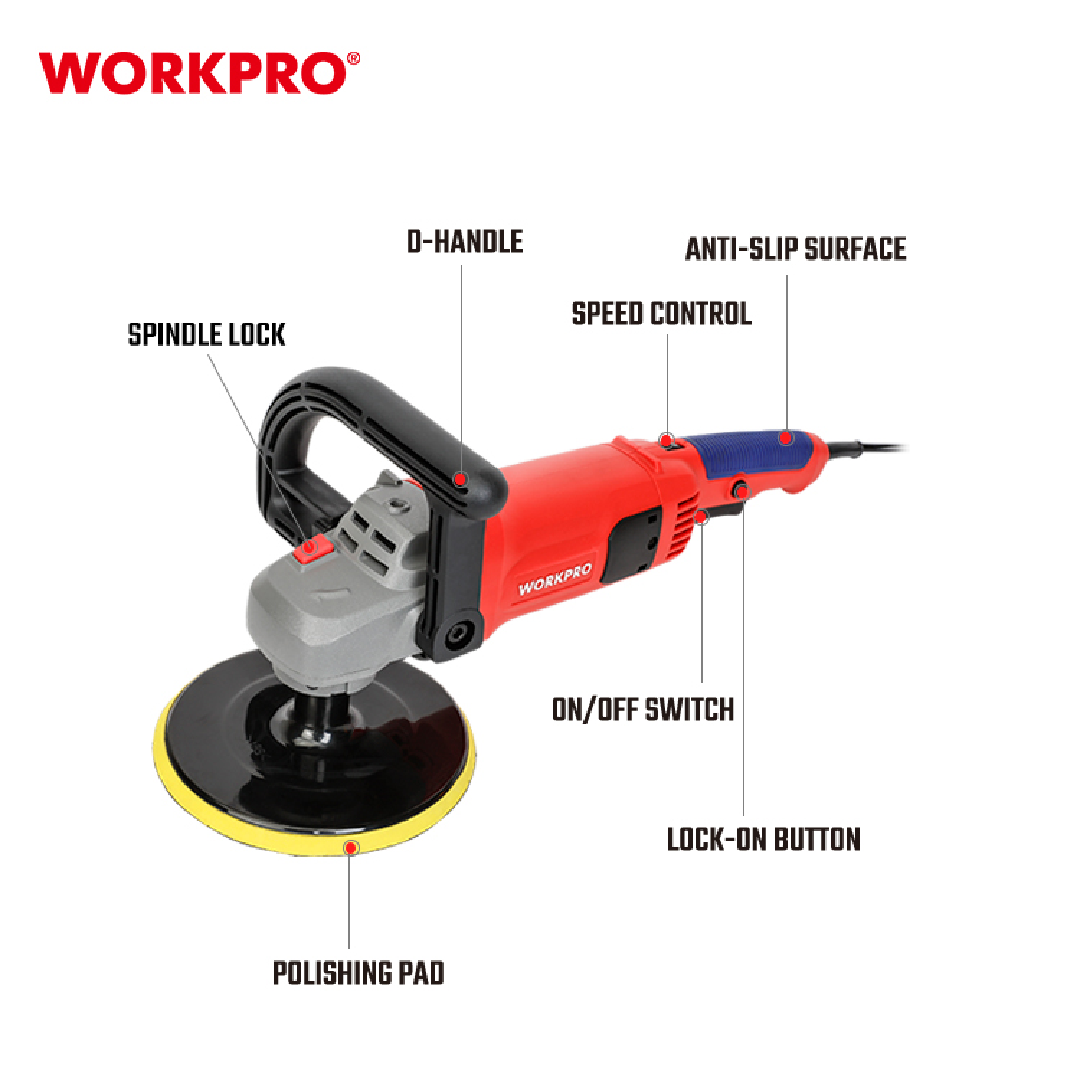 جهاز تلميع احترافي من WORKPRO — موديل WP472404 مزود بقدرة عالية تبلغ 1400W مع صحن تلميع مقاس 180 مم، ليمنحك أداءً قوياً وسرعة في تلميع الأسطح المختلفة. مناسب للسيارات، المعادن، الخشب، والأعمال الاحترافية في ورش الصيانة والتشطيب.