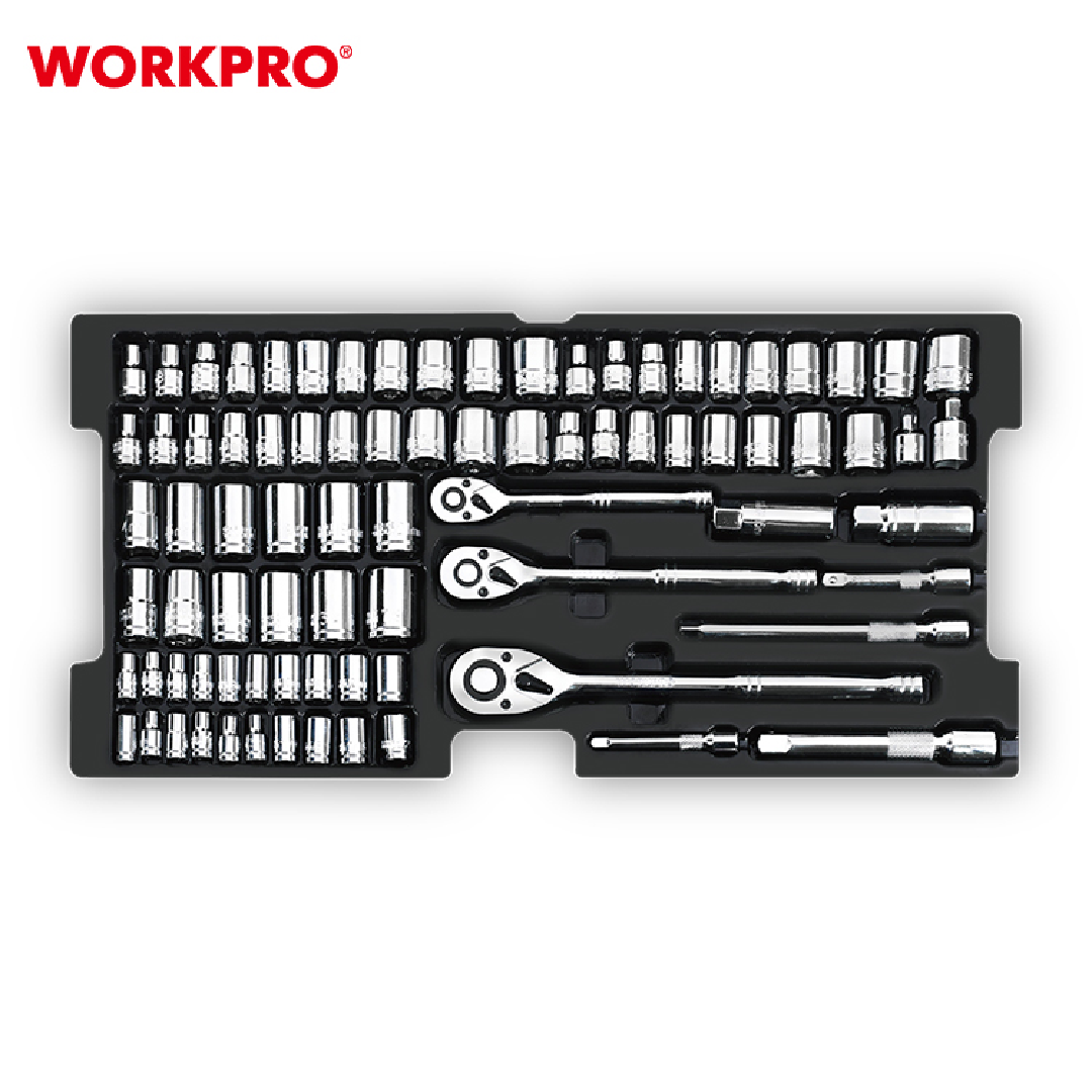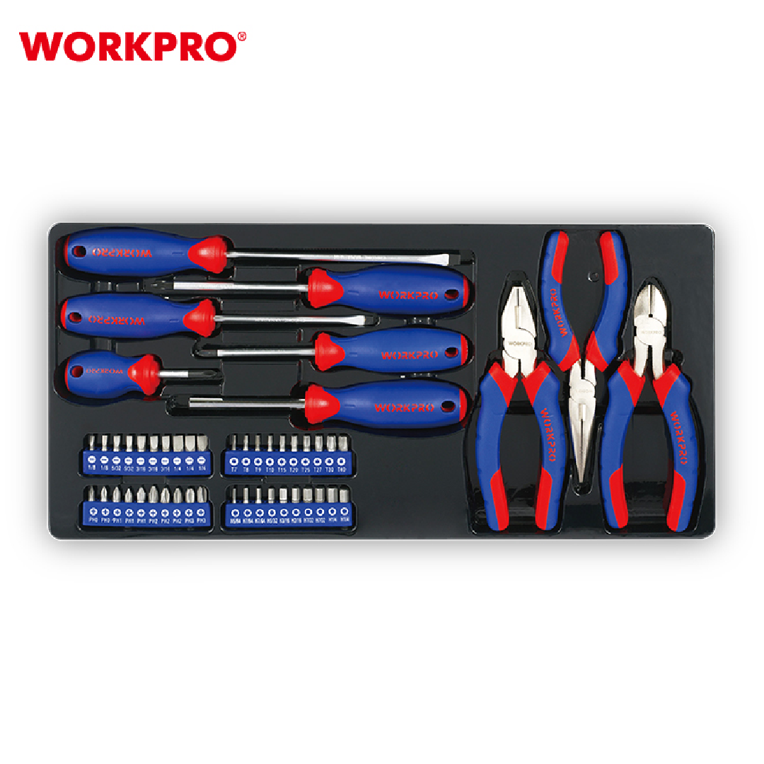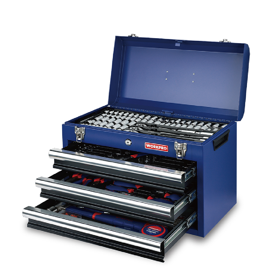 طقم أدوات ميكانيكي احترافي من WORKPRO — موديل WP209034، يحتوي على 408 قطعة شاملة من أدوات الصيانة والميكانيكا، مرتبة داخل صندوق معدني ثقيل مزود بـ 3 أدراج لسهولة التنظيم والوصول السريع. مناسب للورش، مراكز الصيانة، والاستخدام الاحترافي والمنزلي المتقدم.