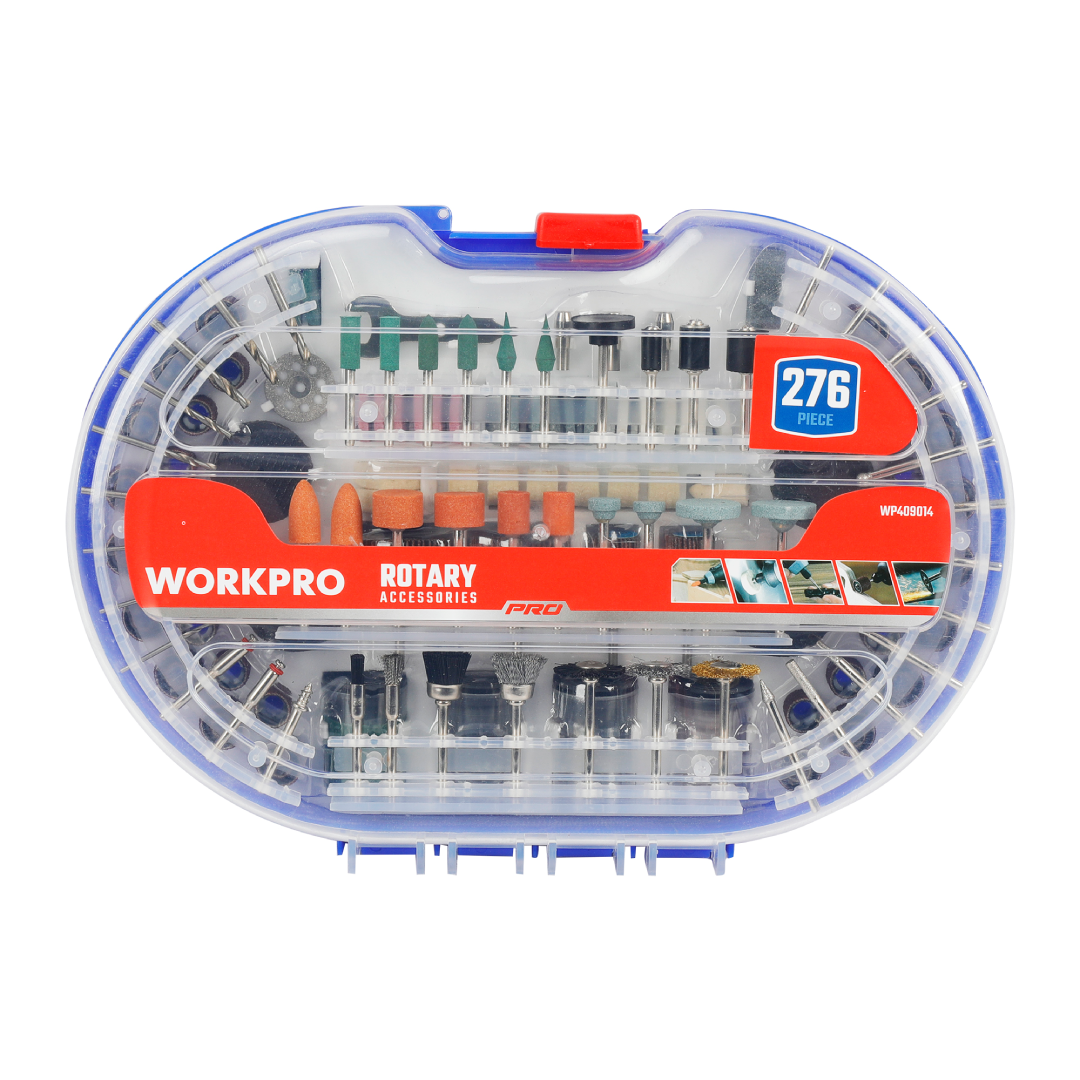 طقم إكسسوارات احترافي لأدوات الروتاري من WORKPRO — موديل WP409014، يضم 276 قطعة من مستلزمات القطع والجلخ والصنفرة والتلميع والنقش، مما يجعله خيارًا مثاليًا لجميع الأعمال الدقيقة ومشاريع DIY. يناسب جميع أجهزة الروتاري الكهربائية مثل WORKPRO وDremel وغيرها.