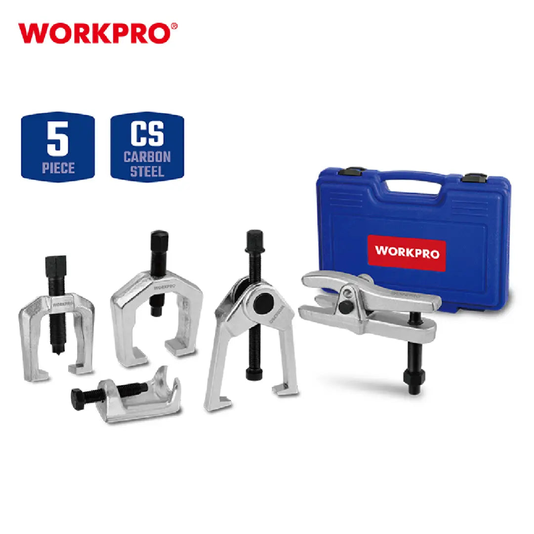 طقم مفصلات فصل الجوزات ورؤوس الدركسون من ورك برو (WORKPRO) – 5 قطع – موديل WP204011 – هو الحل الهندسي الأمثل لفك وصلات نظام التوجيه والتعليق دون الحاجة إلى استخدام المطارق التي قد تتلف الأجزاء الحساسة. يجمع هذا الطقم بين طريقتين للفصل (الكبس والشوكة)، مما يمنح الفني مرونة كاملة في التعامل مع مختلف أنواع السيارات والمساحات الضيقة.