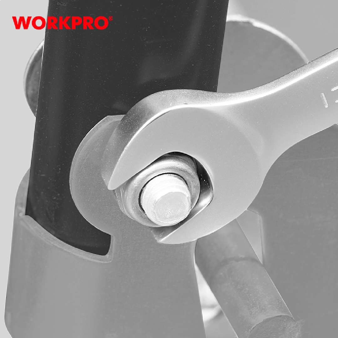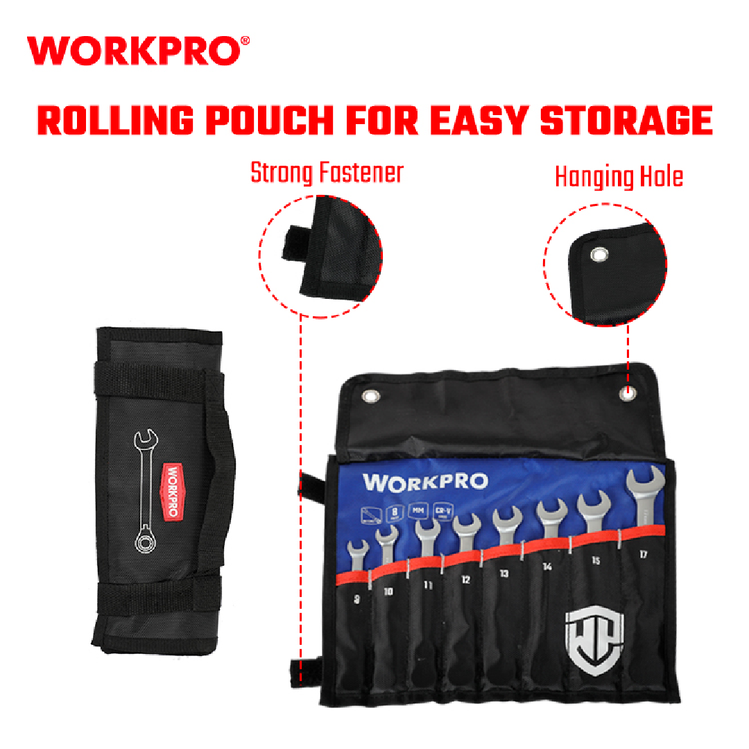 طقم شق رنق طرطيقة WORKPRO WP202521 المكوّن من 8 قطع هو مجموعة احترافية من مفاتيح الربط عالية الجودة المصمّمة للمحترفين وهواة الأعمال اليدوية. كل مفتاح مصنوع من فولاذ الكروم‑فاناديوم (Cr‑V) ومعالجة حرارياً لتعزيز القوة والمتانة، ويتميّز بلمسة نهائية مطلية بالكروم لمقاومة التآكل. تتضمّن المجموعة مقاسات مترية مدروسة (من 9 مم إلى 17 مم) لتغطية غالبية التطبيقات، وتُحفظ في حقيبة أو كيس تخزين عملي لسهولة الاستخدام والتنقل.