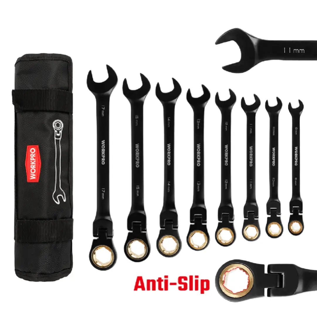 طقم مفاتيح ربط كومبنيشن (مشرشر وعادي) مرنة ومضادة للانزلاق من ورك برو (WORKPRO) – 8 قطع – موديل WP202603 – هو المجموعة المتكاملة التي تجمع بين سرعة الراتشيت (Ratcheting) ودقة الوصول. بفضل الرأس المرن الذي يتحرك بزاوية 180 درجة وتصميم الفك المضاد للانزلاق، يوفر هذا الطقم حلاً احترافياً لفك البراغي في أكثر الزوايا تعقيداً وضيقاً.