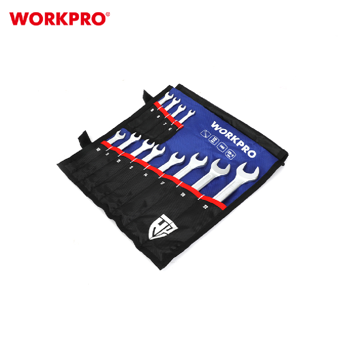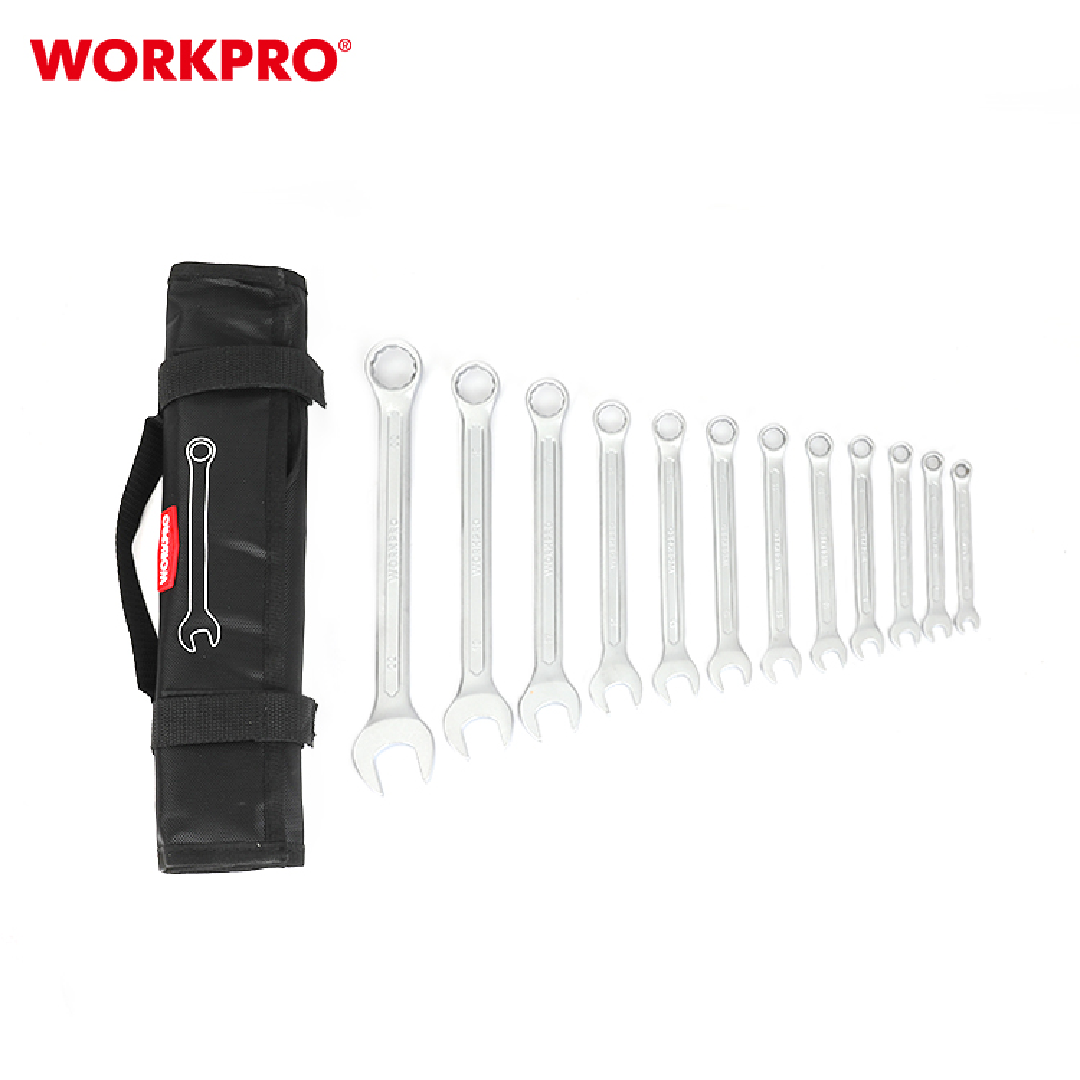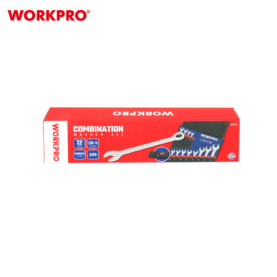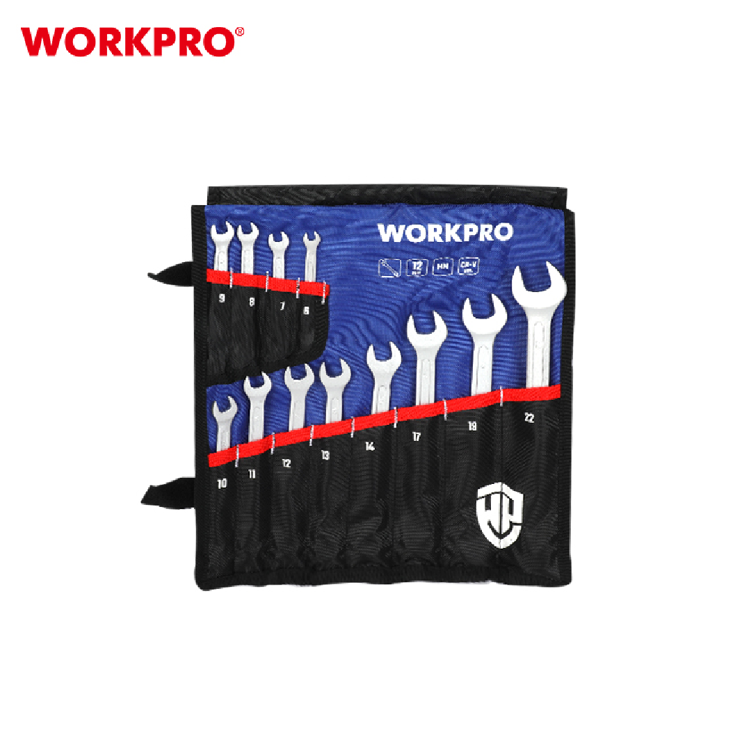 طقم شق رنق WORKPRO WP202576 المكوّن من 12 قطعة هو مجموعة احترافية من مفاتيح الربط عالية الجودة المصمّمة للمحترفين وهواة الأعمال اليدوية. كل مفتاح مصنوع من فولاذ الكروم-فاناديوم (Cr-V) ومعالج حرارياً لتعزيز القوة والمتانة، ويتميّز بلمسة نهائية مطلية بالكروم ومصقولة بالرمل لمقاومة التآكل. تتضمّن المجموعة مقاسات مترية شائعة لتناسب مختلف التطبيقات، من إصلاحات المنزل إلى صيانة السيارات، وتأتي بتخزين عملي يسهل نقله وحفظه.
