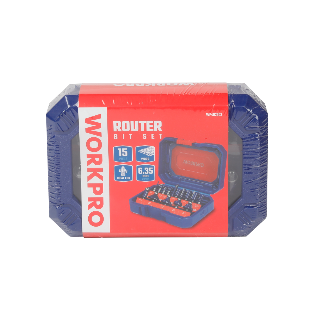 طقم ريش راوتر خشب احترافي من WORKPRO — موديل WP402303، يتكوّن من 15 قطعة متنوعة بساق قياس 6.35 مم (1/4 بوصة)، مصمم لتنفيذ أعمال التشكيل، الحفر، التشطيب، والحواف بدقة عالية في مختلف مشاريع النجارة.