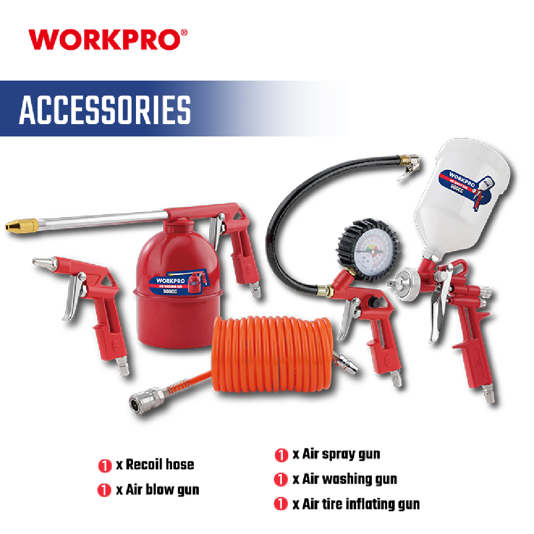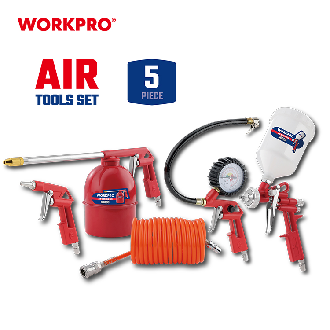 طقم أدوات هواء احترافي من WORKPRO موديل WP512000، يحتوي على 5 أدوات أساسية تعمل بالهواء المضغوط، مصمم ليغطي معظم احتياجات الورش مثل التنظيف، النفخ، الرش، القياس، والملء. يأتي هذا الطقم كحل متكامل ومثالي للاستخدام المنزلي والمهني على حد سواء.