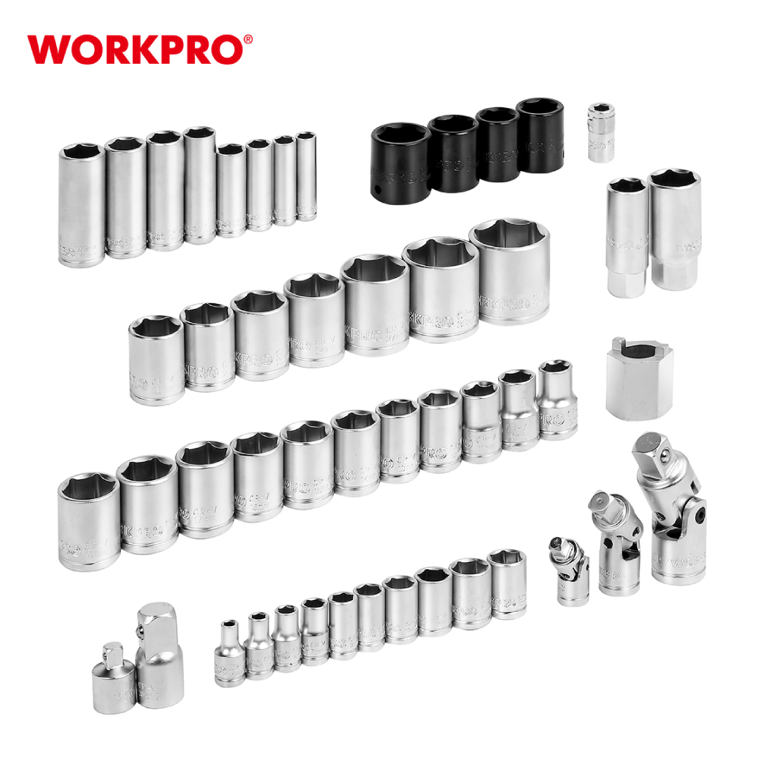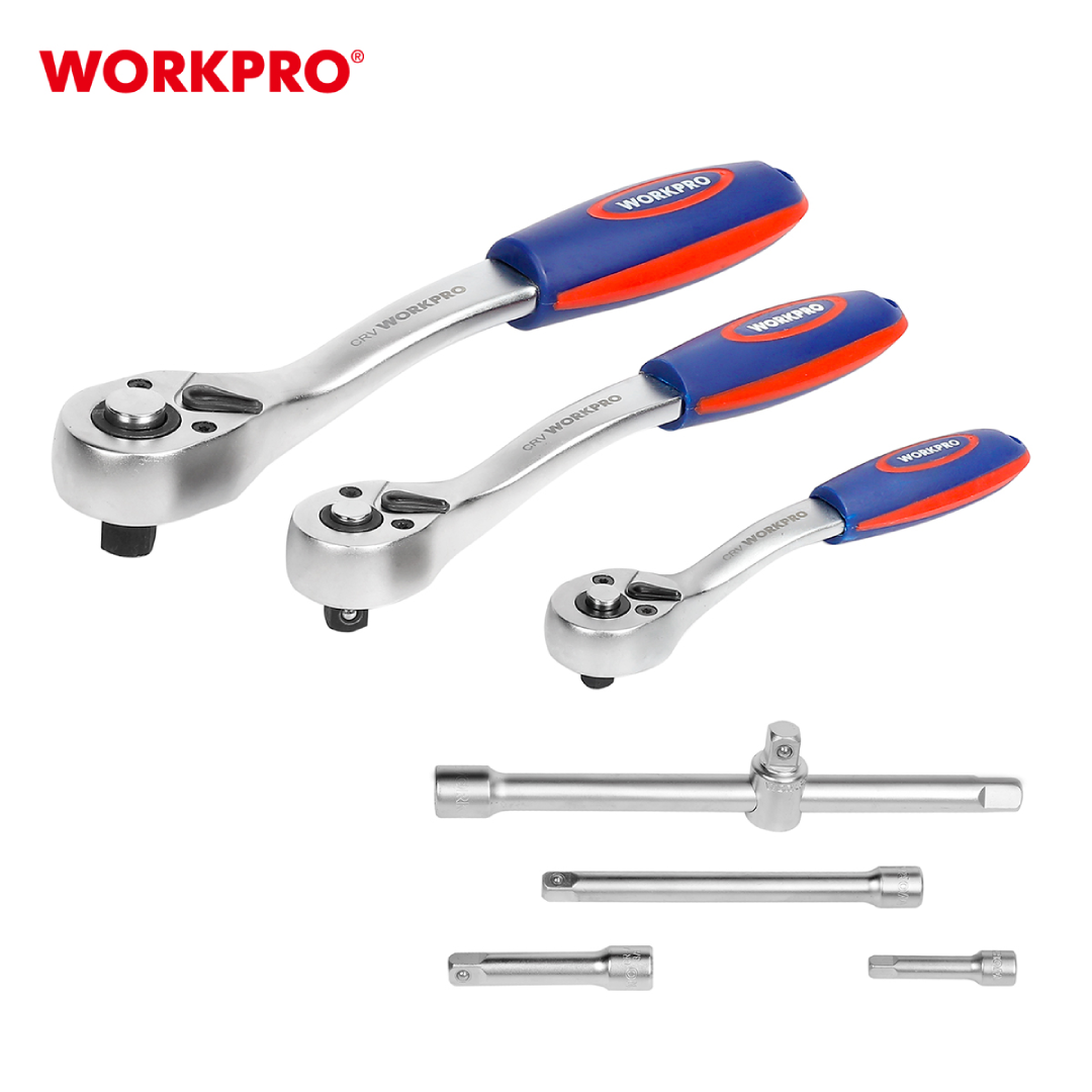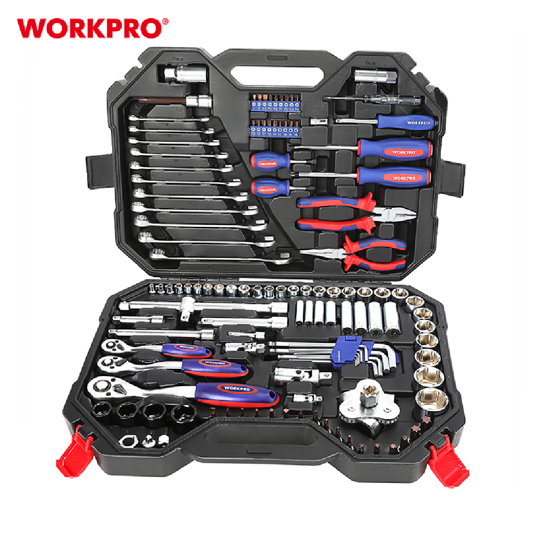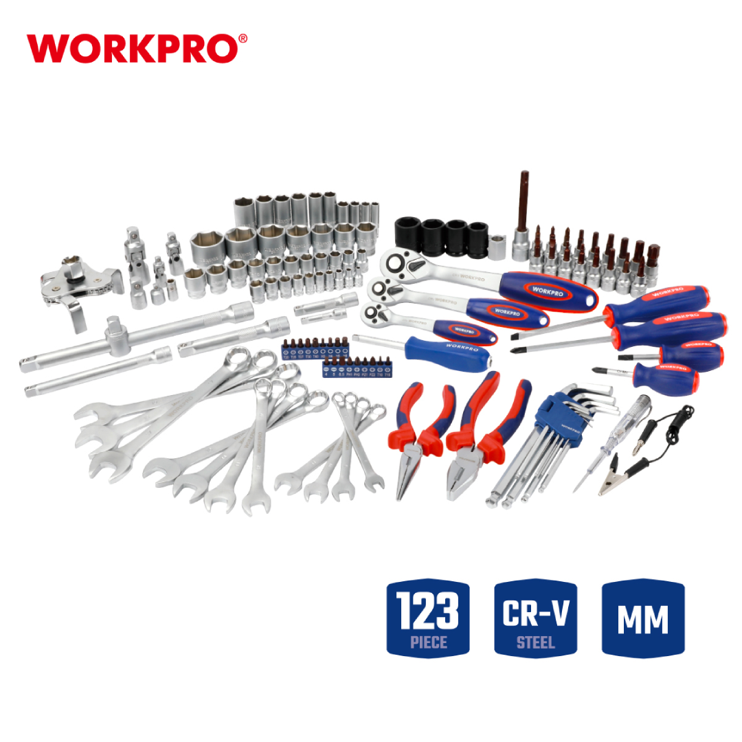 طقم أدوات ميكانيكي شامل من WORKPRO — موديل WP202533، مكوّن من 123 قطعة احترافية تغطي معظم أعمال الصيانة الميكانيكية وصيانة السيارات. يضم الطقم مقابس وأدوات مصنوعة من فولاذ كروم-فاناديوم (CR-V) عالي الجودة، محفوظة داخل علبة مصبوبة متينة توفّر حماية ممتازة وسهولة في التنظيم والنقل.