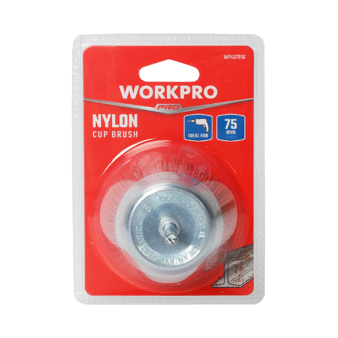 - فرشاة كأس WORKPRO بأسلاك نايلون بقطر 75 مم مع عمود تثبيت 6.3 مم