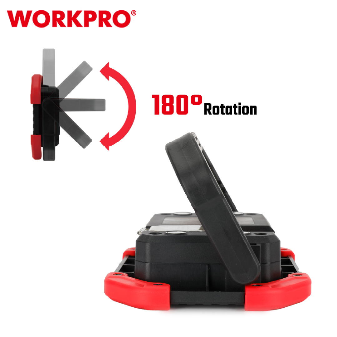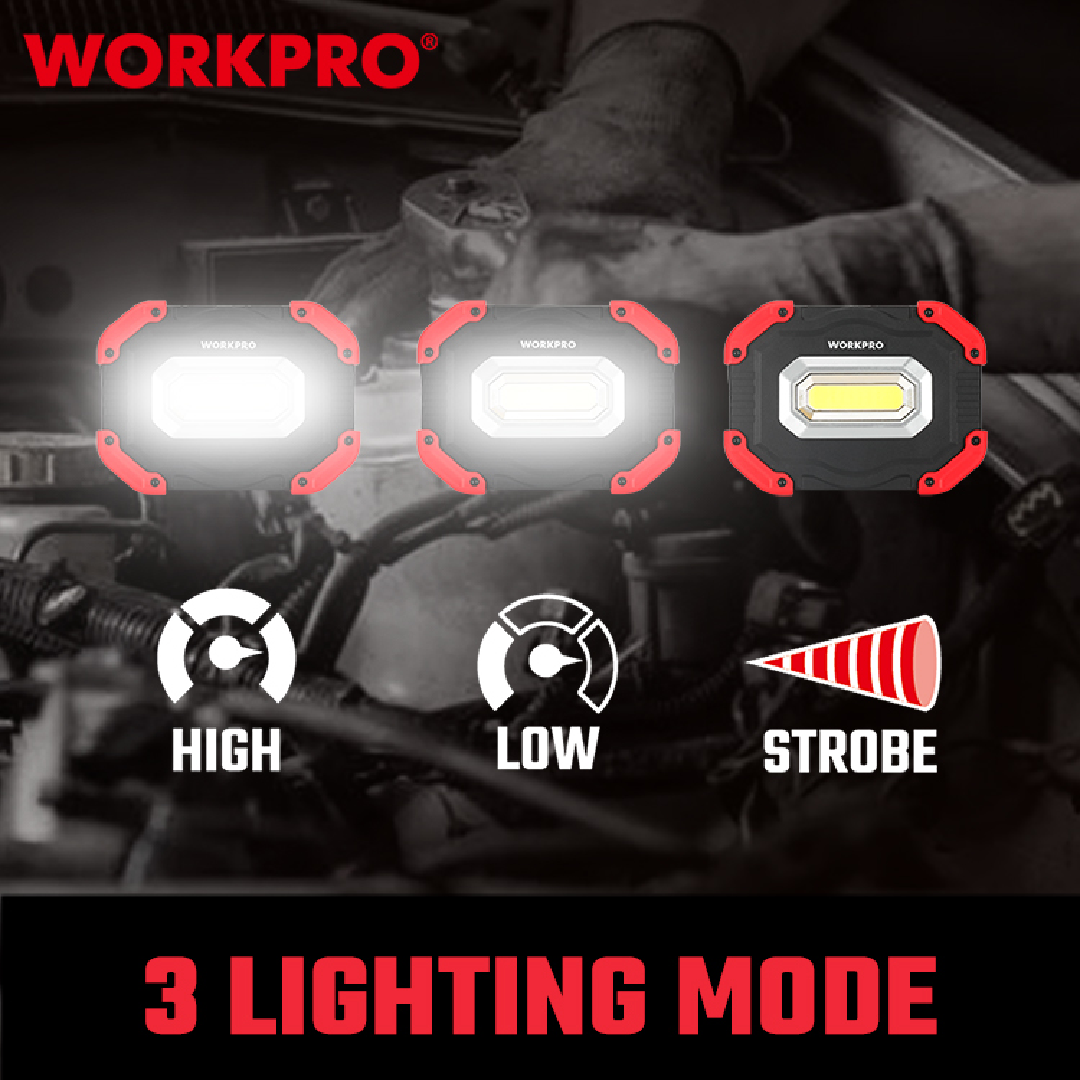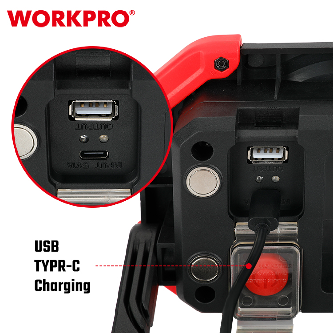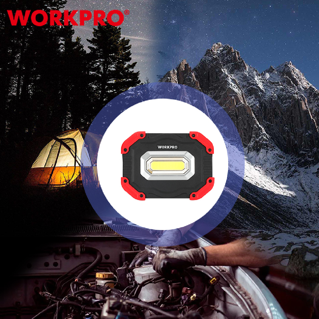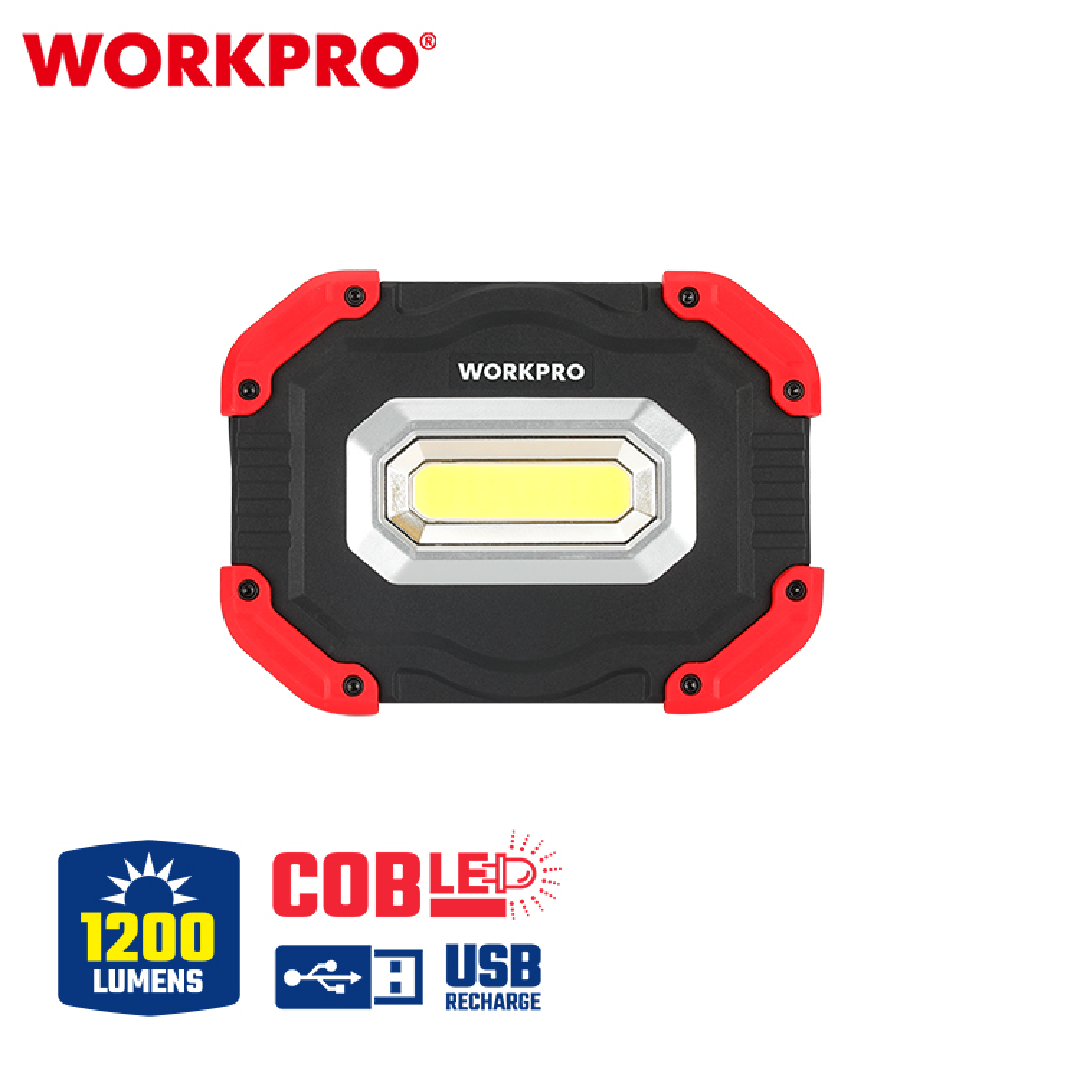 مصباح عمل احترافي قابل لإعادة الشحن من WORKPRO — موديل WP352004WE، يوفر إضاءة قوية تصل إلى 1200 لومن مع تصميم متين ومحمول، مثالي للاستخدام في الورش، الصيانة، مواقع العمل، والتخييم.
