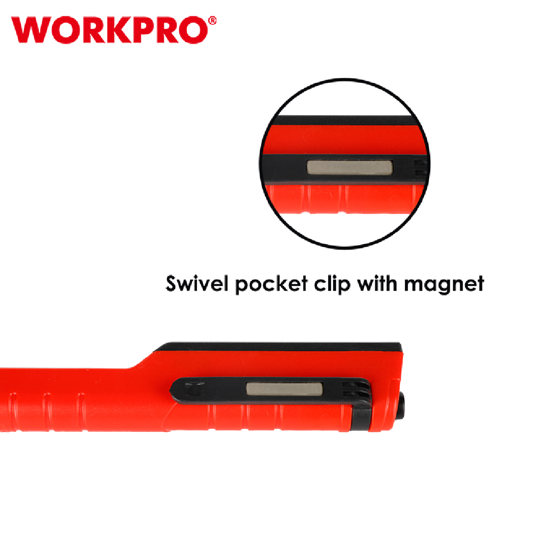 كشاف قلم احترافي من WORKPRO — موديل WP351012WE، يعمل بتقنية COB LED ويوفر إضاءة قوية ومركّزة مع تصميم نحيف يسهل حمله في الجيب. مثالي للفنيين، ميكانيكيي السيارات، المهندسين، وأعمال الصيانة اليومية.