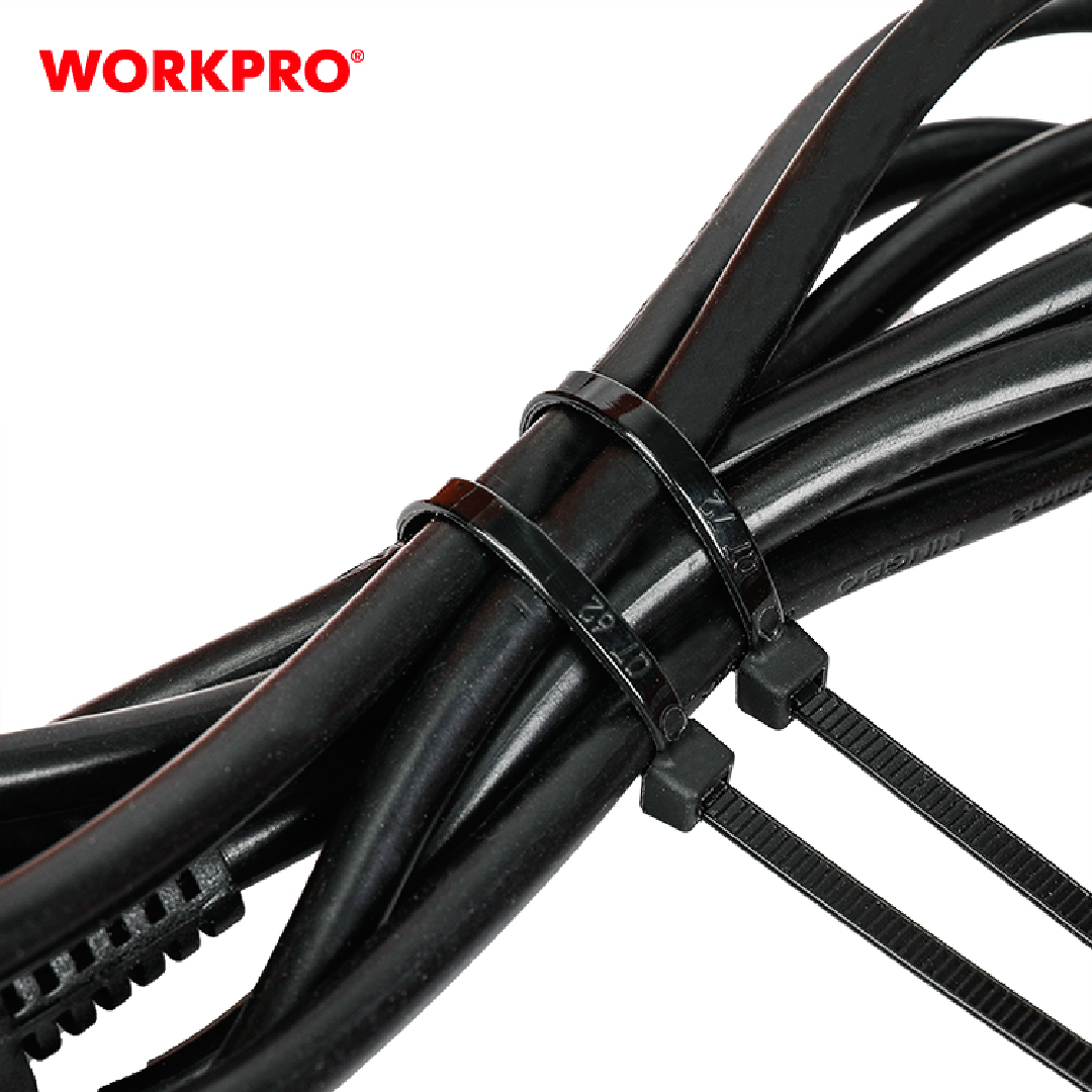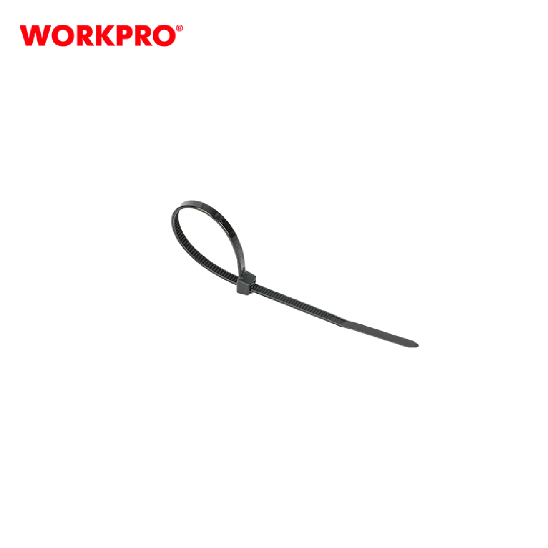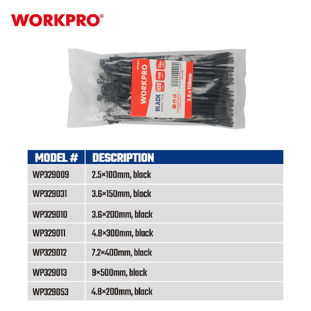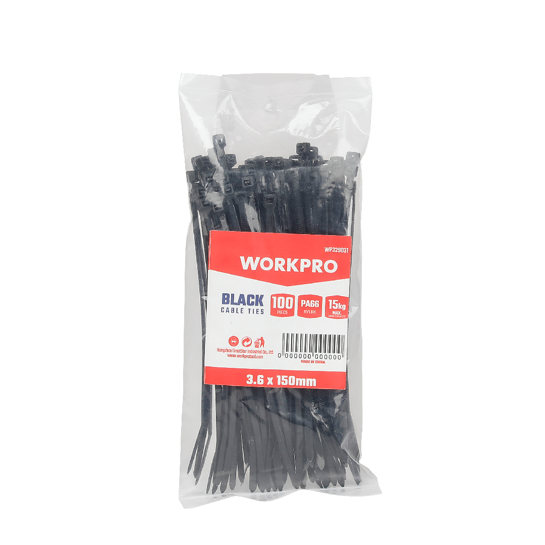 أربطة كابلات عالية الجودة من WORKPRO — موديل WP329009، تأتي في عبوة تحتوي على 100 رباط باللون الأسود، بمقاس 2.5 × 100 مم، مثالية لتنظيم وتثبيت الكابلات الصغيرة في المنازل والمكاتب. مصنوعة من نايلون متين يضمن قوة شد جيدة وثبات في مختلف ظروف الاستخدام.