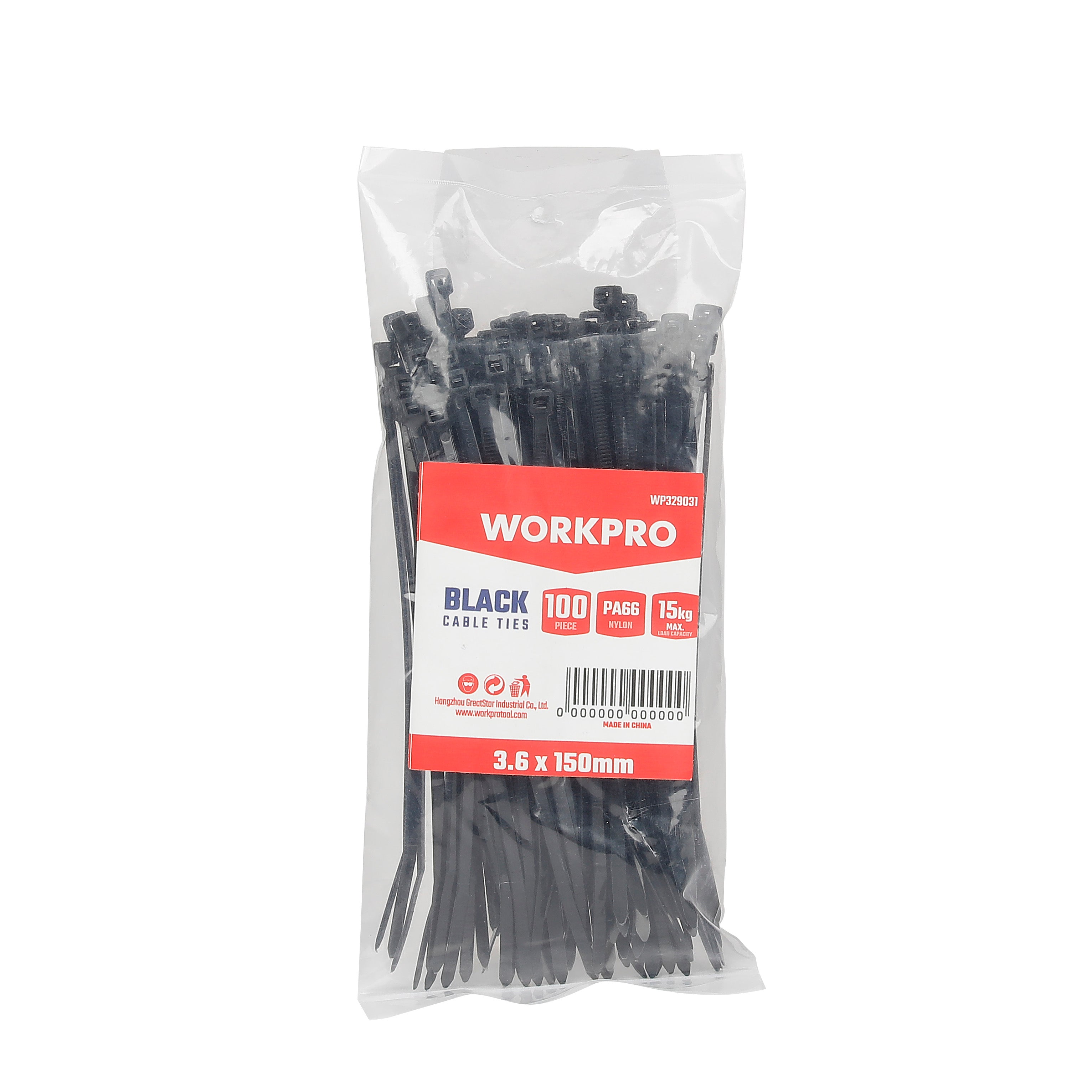 أربطة كابلات عالية الجودة من WORKPRO — موديل WP329031، تأتي في عبوة تحتوي على 100 رباط باللون الأسود، بطول 150 مم، مثالية لتنظيم الكابلات والأسلاك في المنازل والمكاتب والورش. مصنوعة من نايلون متين يوفر قوة شد ممتازة وثبات طويل الأمد.