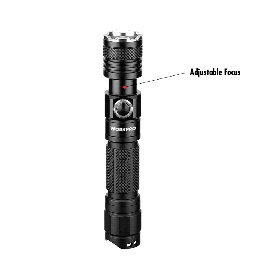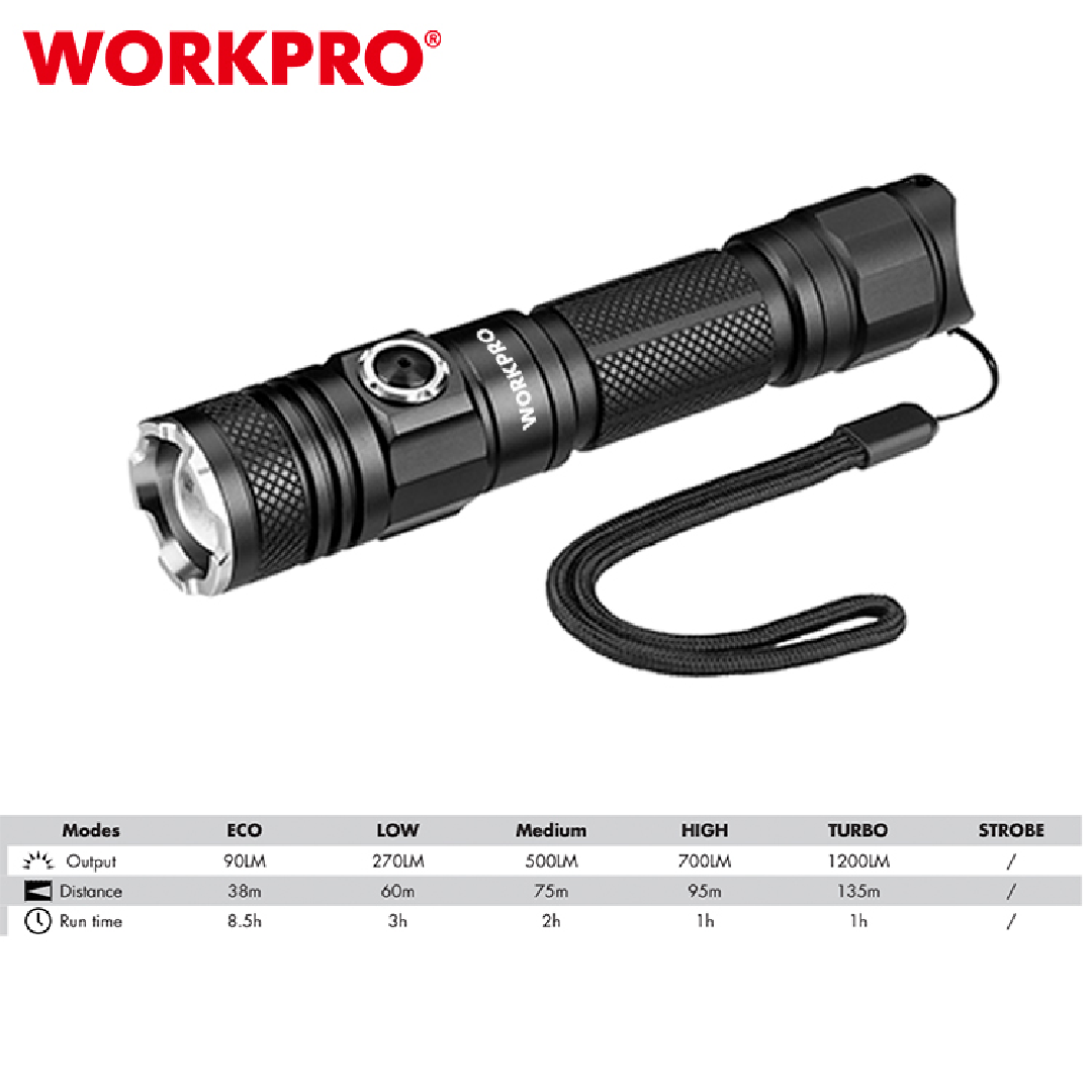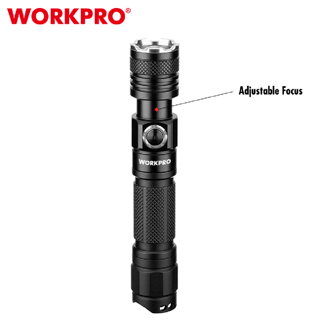 كشاف ألمنيوم احترافي قابل للشحن من WORKPRO — موديل WP351006WE، يتميز بسطوع قوي يصل إلى 1200 لومن مع خاصية Zoomable التي تتيح التحكم في توسيع أو تركيز شعاع الإضاءة بسهولة. مناسب للاستخدام المهني، التخييم، الطوارئ، والصيانة.