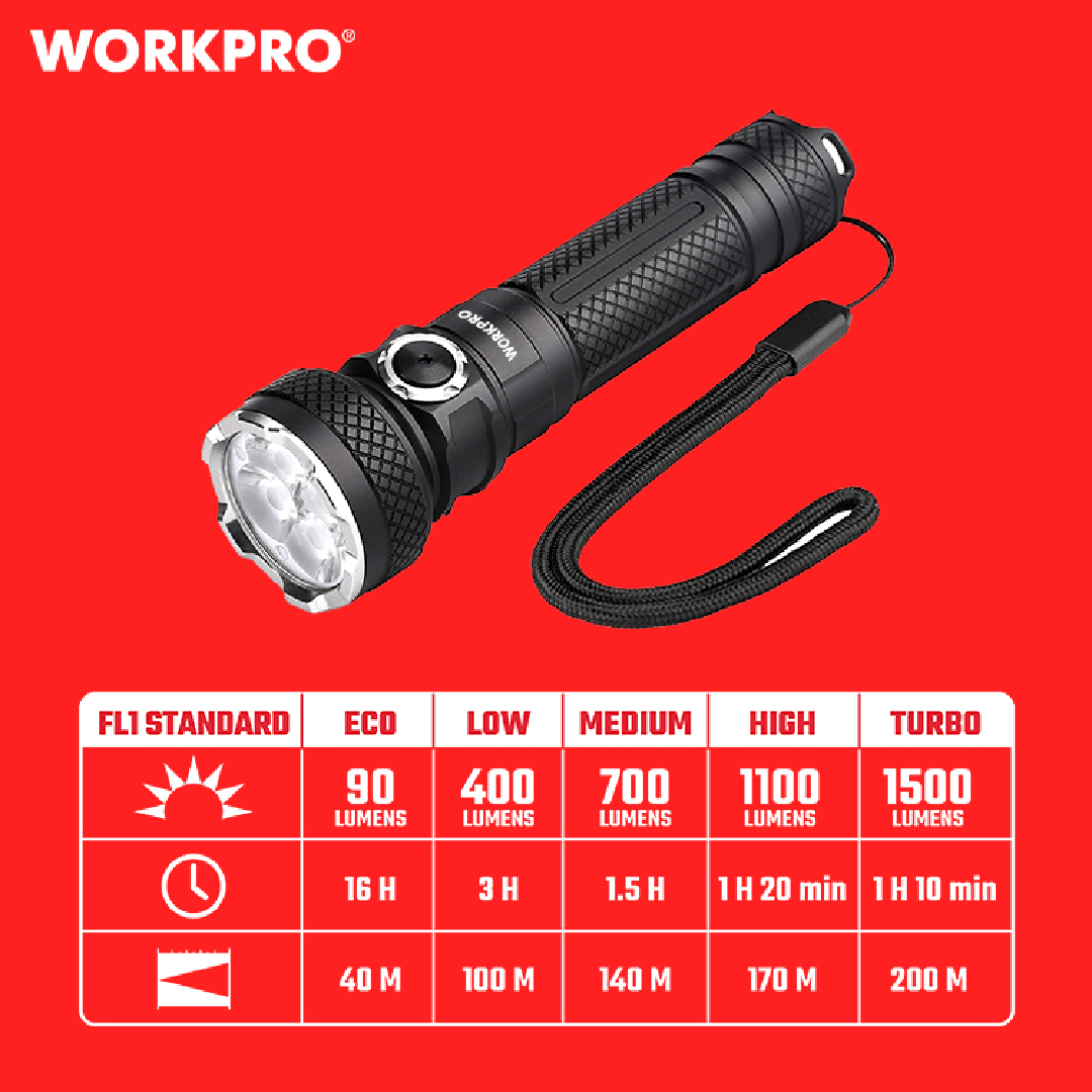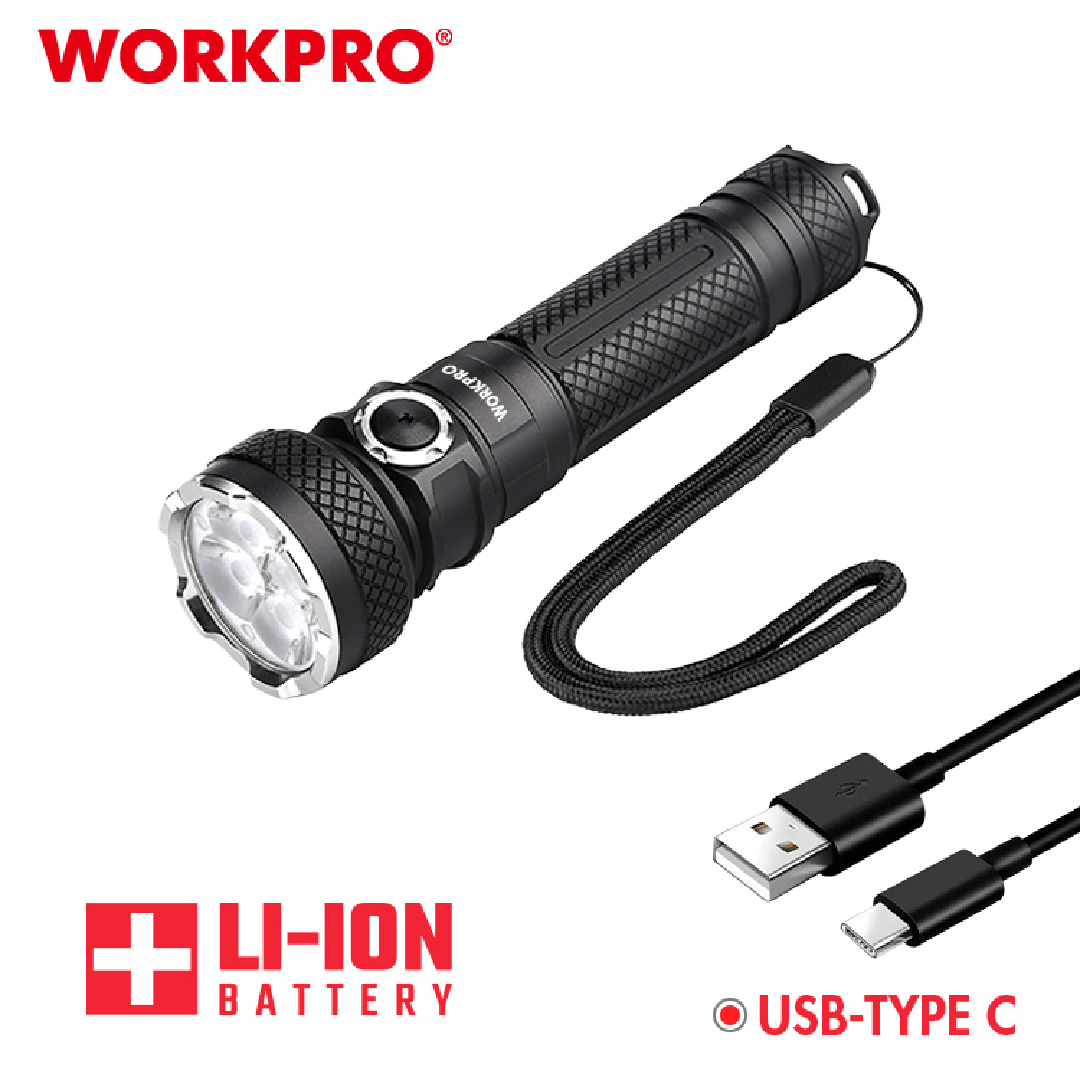 كشاف ألمنيوم قوي قابل لإعادة الشحن من WORKPRO — موديل WP351008، يوفر إضاءة عالية بقوة 1500 لومن مع تصميم متين ومناسب للاستخدام المهني، التخييم، والصيانة اليومية. يتميز هذا الكشاف بسطوع قوي ومدى إضاءة ممتاز، مما يجعله خيارًا مثاليًا للأعمال الداخلية والخارجية.
