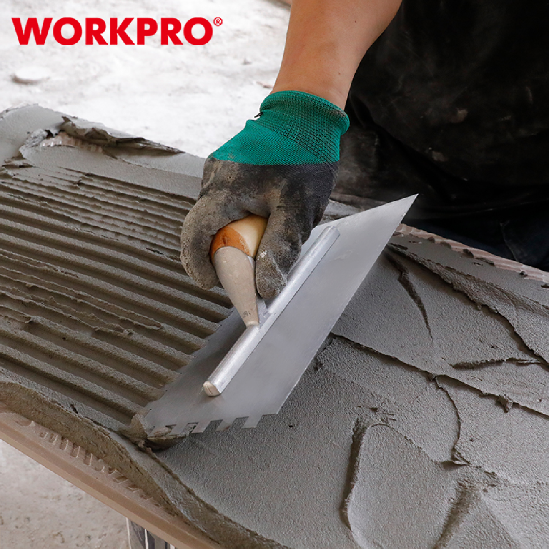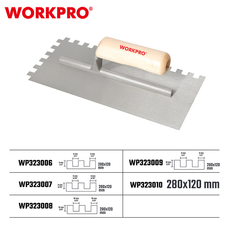 مالج تشطيب عالي الجودة من WORKPRO — موديل WP323008، بمقاس 280 × 120 مم، مزود بمقبض خشبي مريح، ومصمم لتنعيم وتشطيب الأسطح الإسمنتية واللياسة بدقة وسهولة.