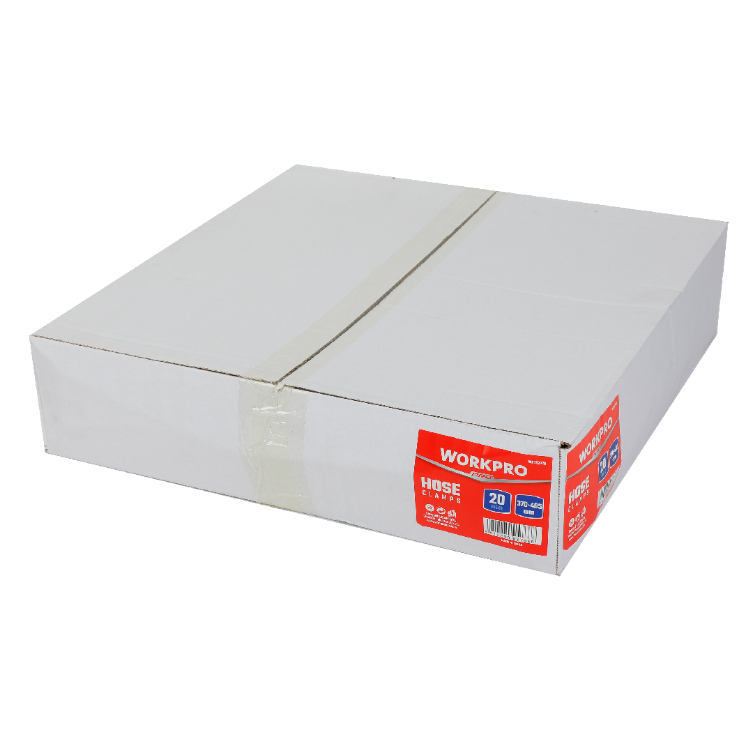 مشابك خراطيم عالية الجودة من WORKPRO — موديل WP362026، تأتي في عبوة تحتوي على 20 مشبك مصنوع من الستانلس ستيل المقاوم للصدأ، بمقاس يتراوح بين 320–355 مم وعرض 12.7 مم وسُمك 0.6 مم. توفر هذه المشابك قوة تثبيت ممتازة للخراطيم الكبيرة في التطبيقات الصناعية والميكانيكية.