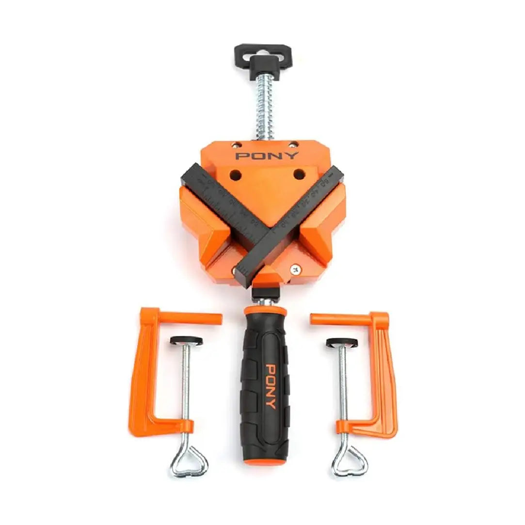 مربط الزوايا مع مرابط الطاولة (Pony Angle Clamp with Table Clamps) – موديل 9180 – الأداة المثالية لتجميع الإطارات والخزائن بدقة متناهية. يتميز هذا المربط بقدرته على تثبيت القطع بزاوية قائمة تماماً، مع توفير مرابط إضافية لتثبيته على طاولة العمل لضمان استقرار مطلق أثناء التجميع.