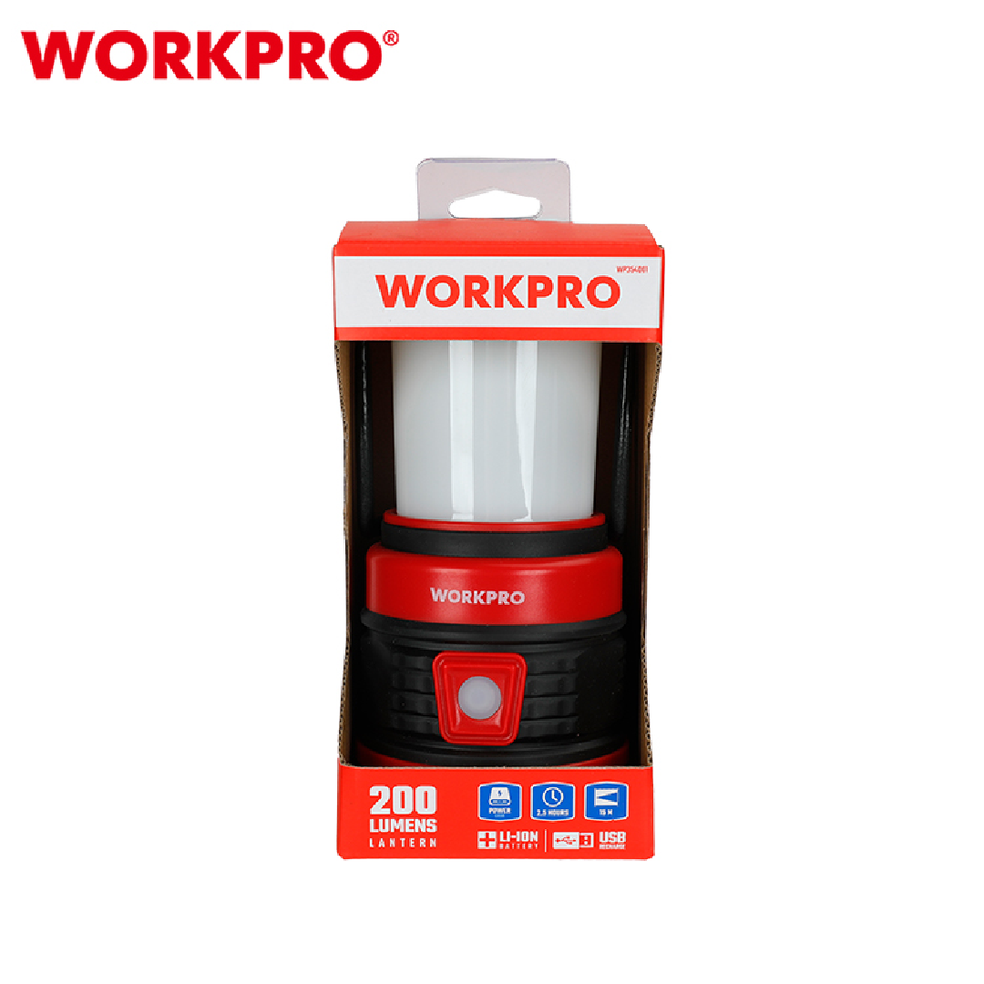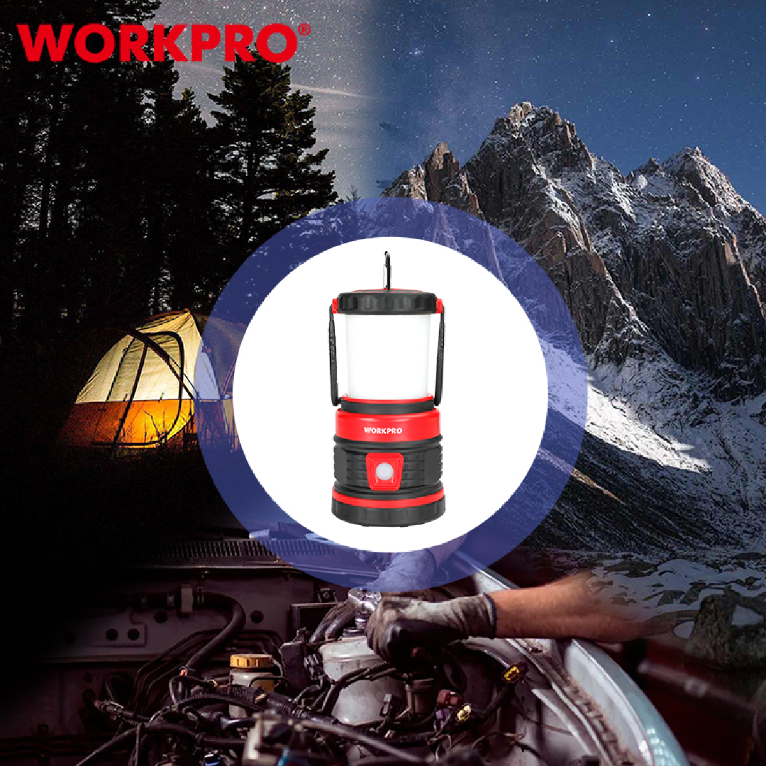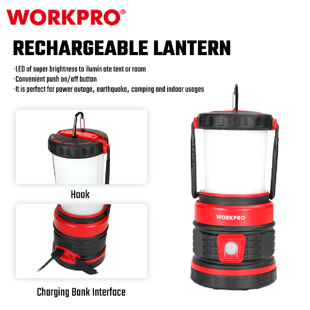 فانوس إضاءة قابل لإعادة الشحن من WORKPRO — موديل WP354001WE، يتميز بإضاءة قوية وتصميم متين، مما يجعله الخيار المثالي للتخييم، الطوارئ، الرحلات، وورش العمل.