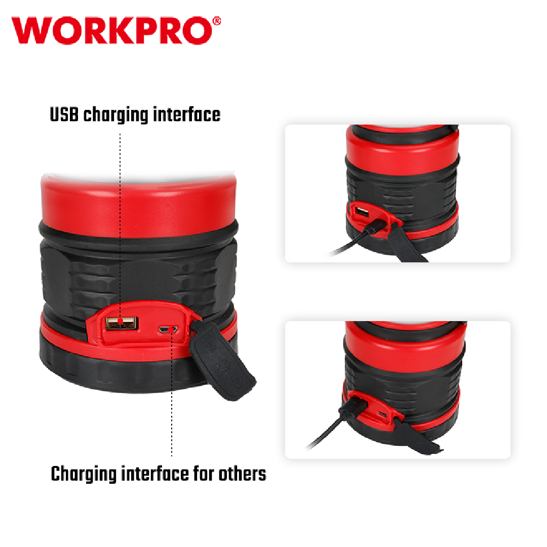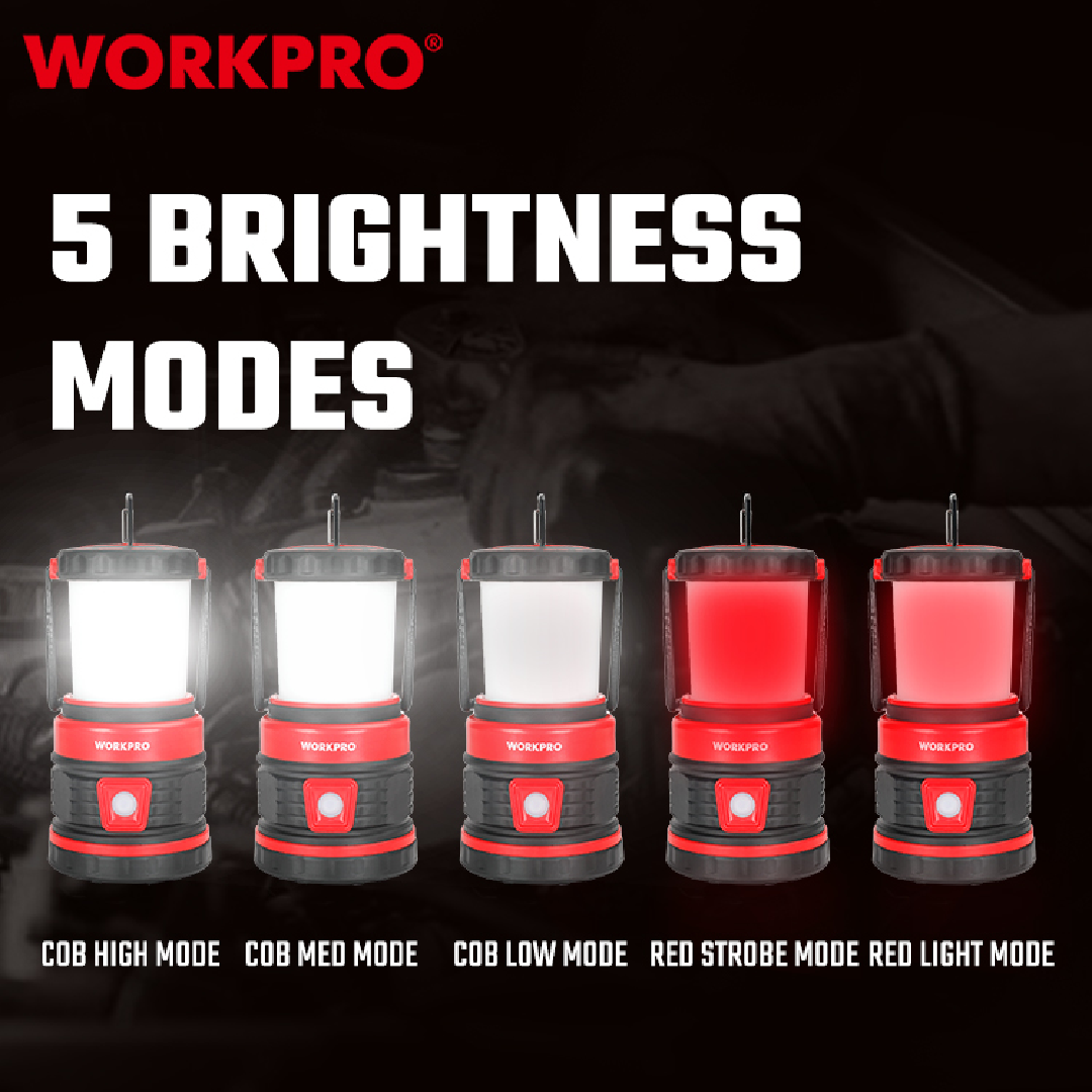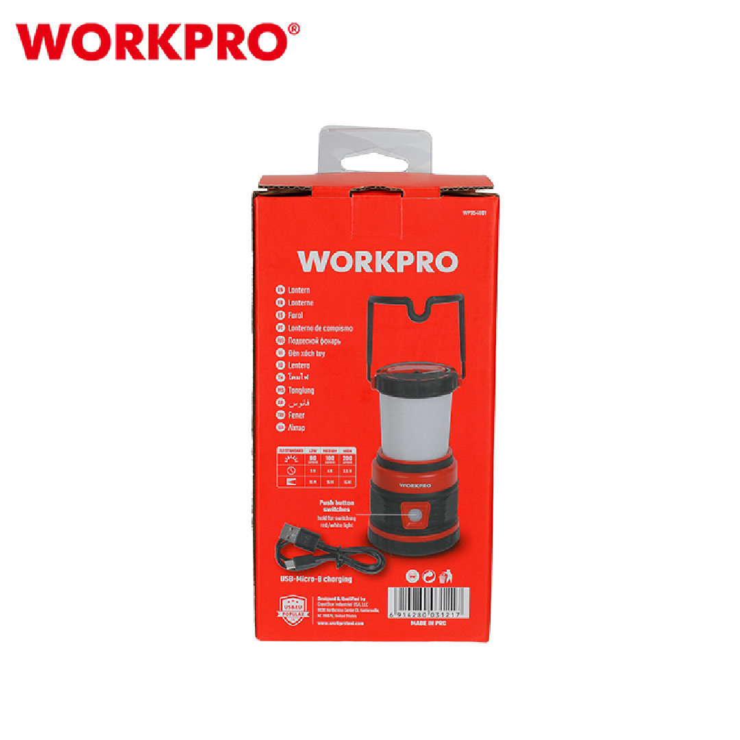فانوس إضاءة قابل لإعادة الشحن من WORKPRO — موديل WP354001WE، يتميز بإضاءة قوية وتصميم متين، مما يجعله الخيار المثالي للتخييم، الطوارئ، الرحلات، وورش العمل.