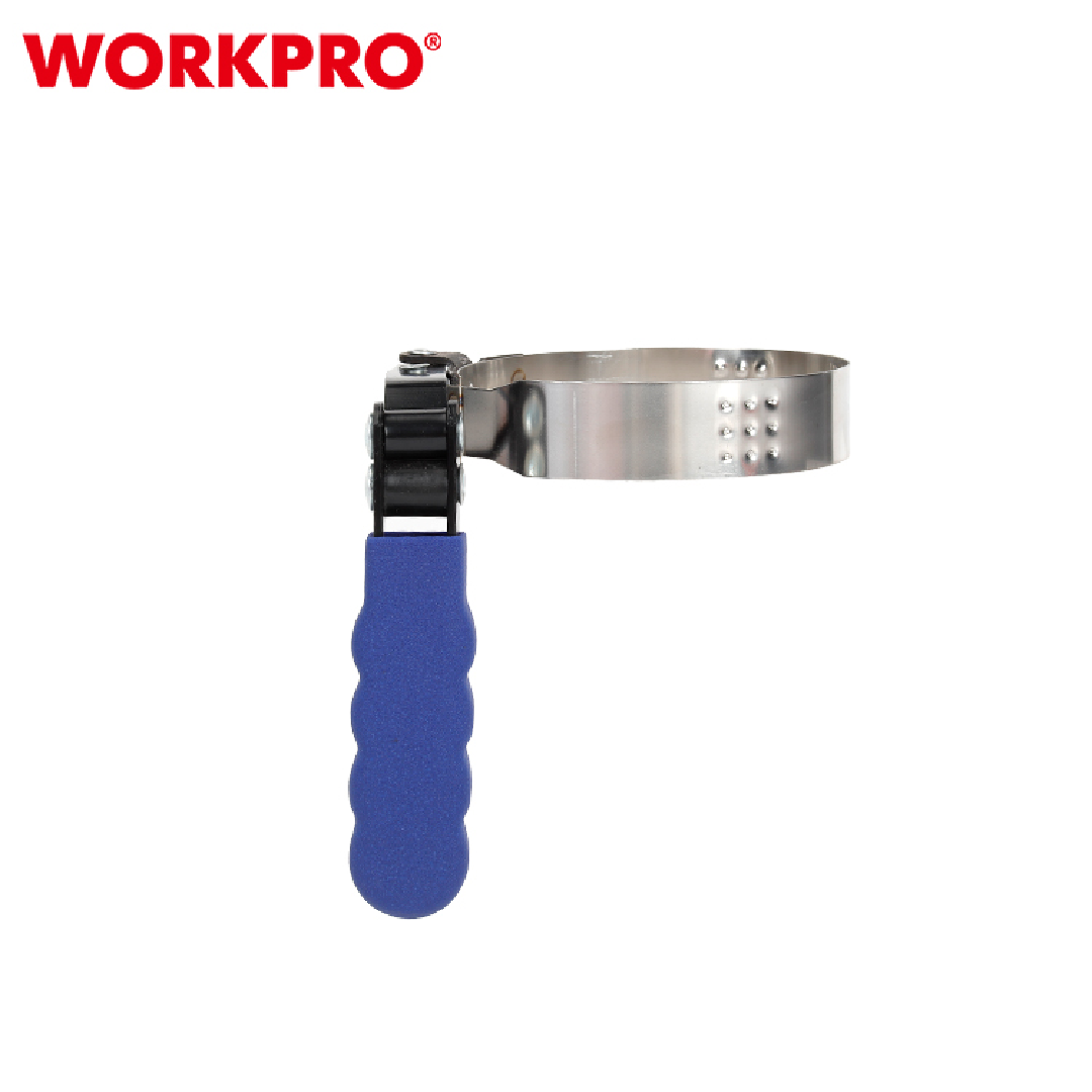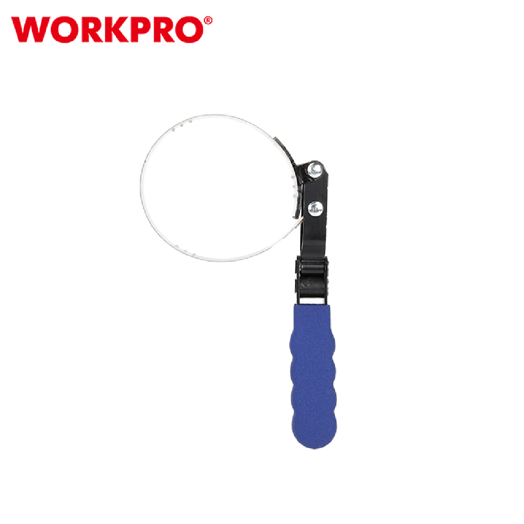 مفتاح فلتر الزيت من WORKPRO موديل WP319014، بتصميم شريط فولاذي قابل للدوران وعريض لتوفير قبضة قوية دون تدمير الفلتر. مناسب للفلاتر ذات قطر بين 105 مم و 115 مم.