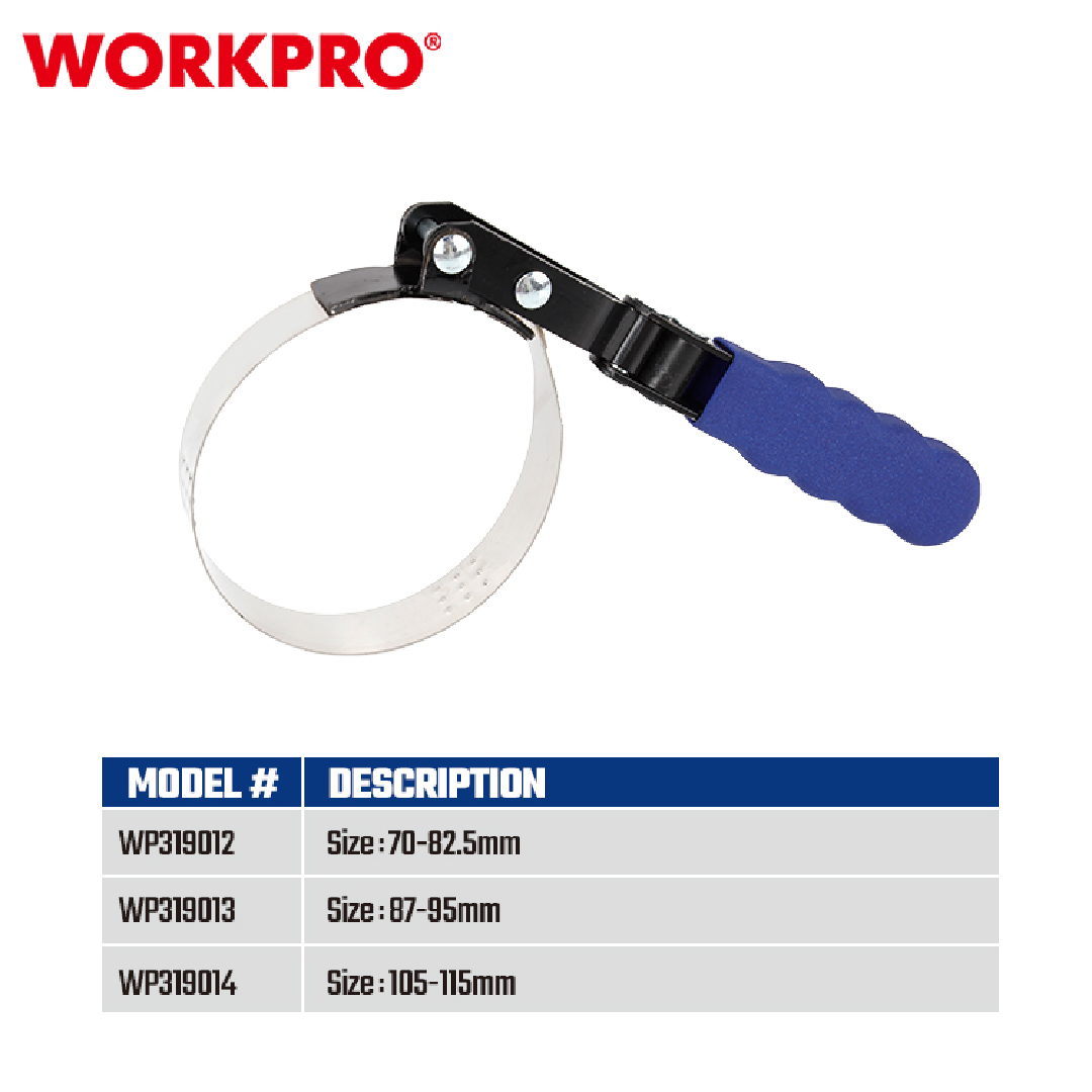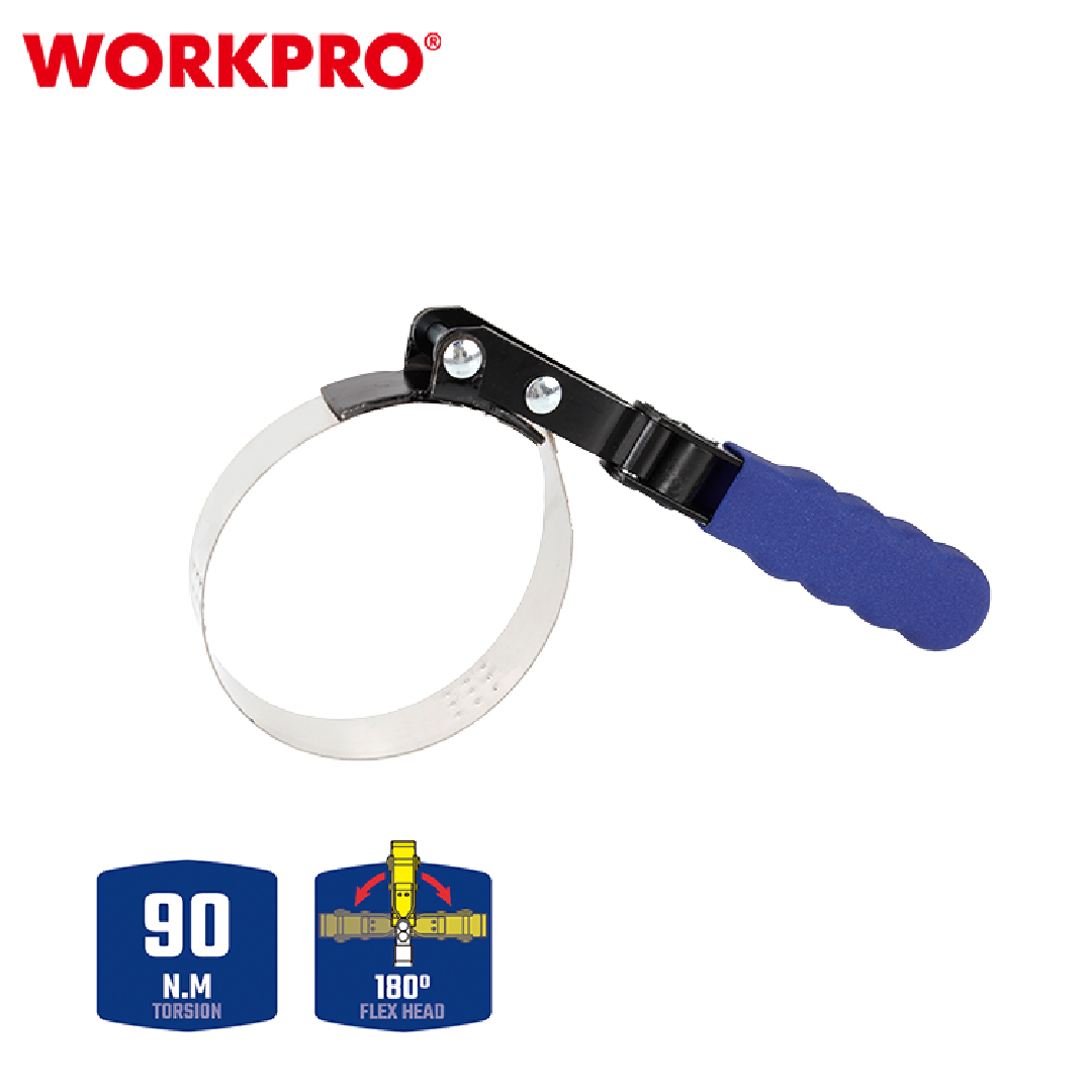 مفتاح فلتر الزيت من WORKPRO موديل WP319013 بتصميم دوار (Swivel)، مخصص للفلاتر بقطر من 87 مم إلى 95 مم. أداة موثوقة وسهلة الاستخدام لفك الفلاتر في الأماكن الضيقة دون تلف.