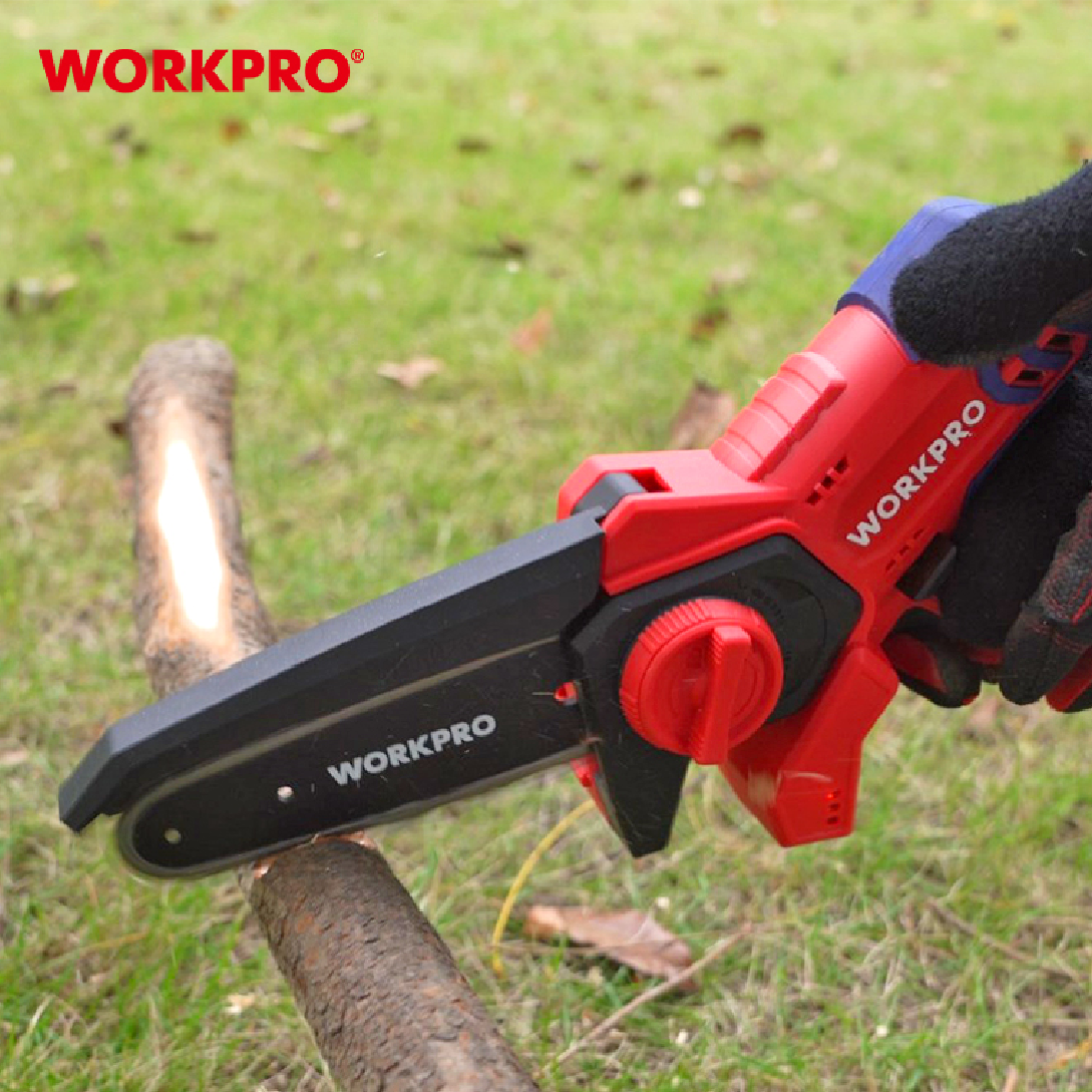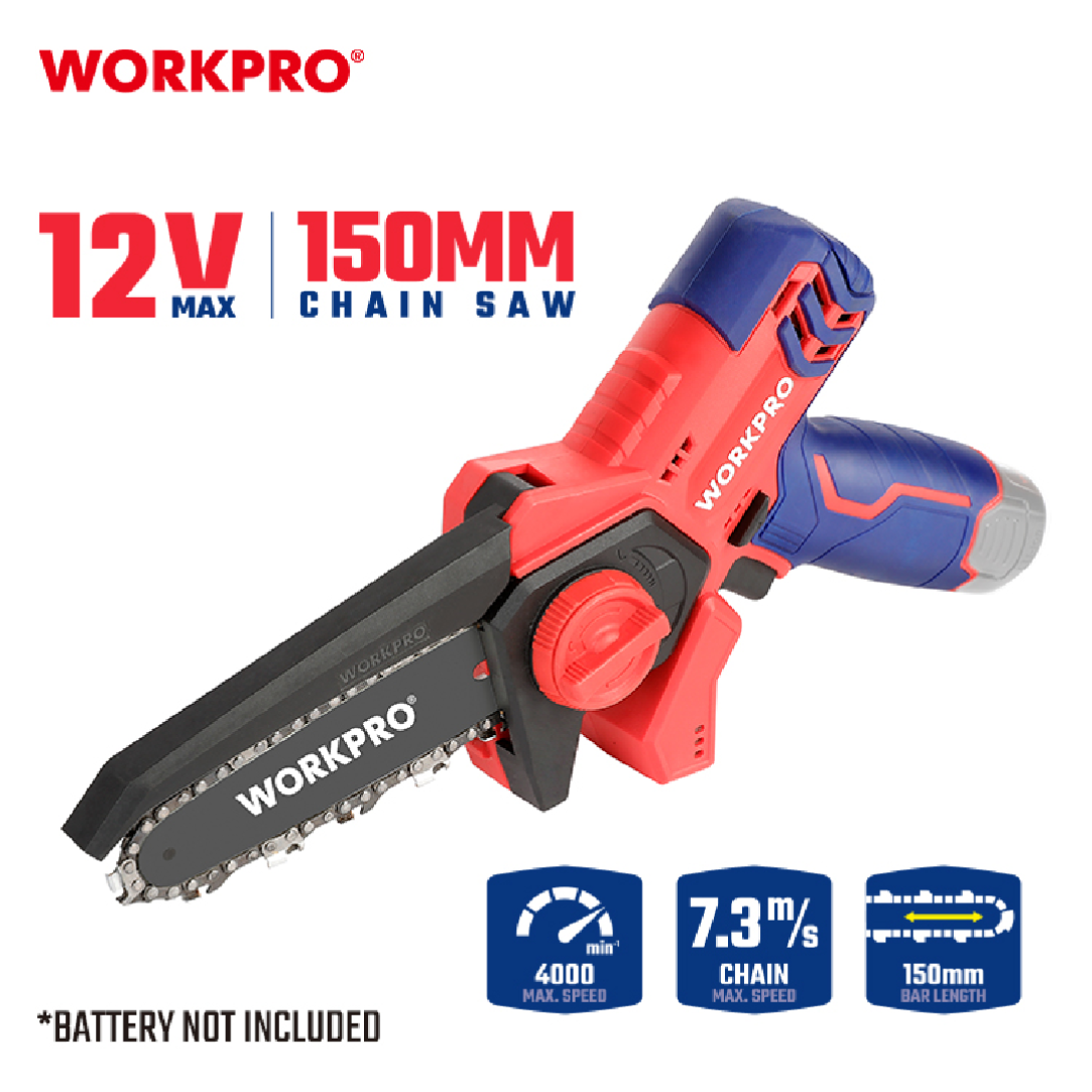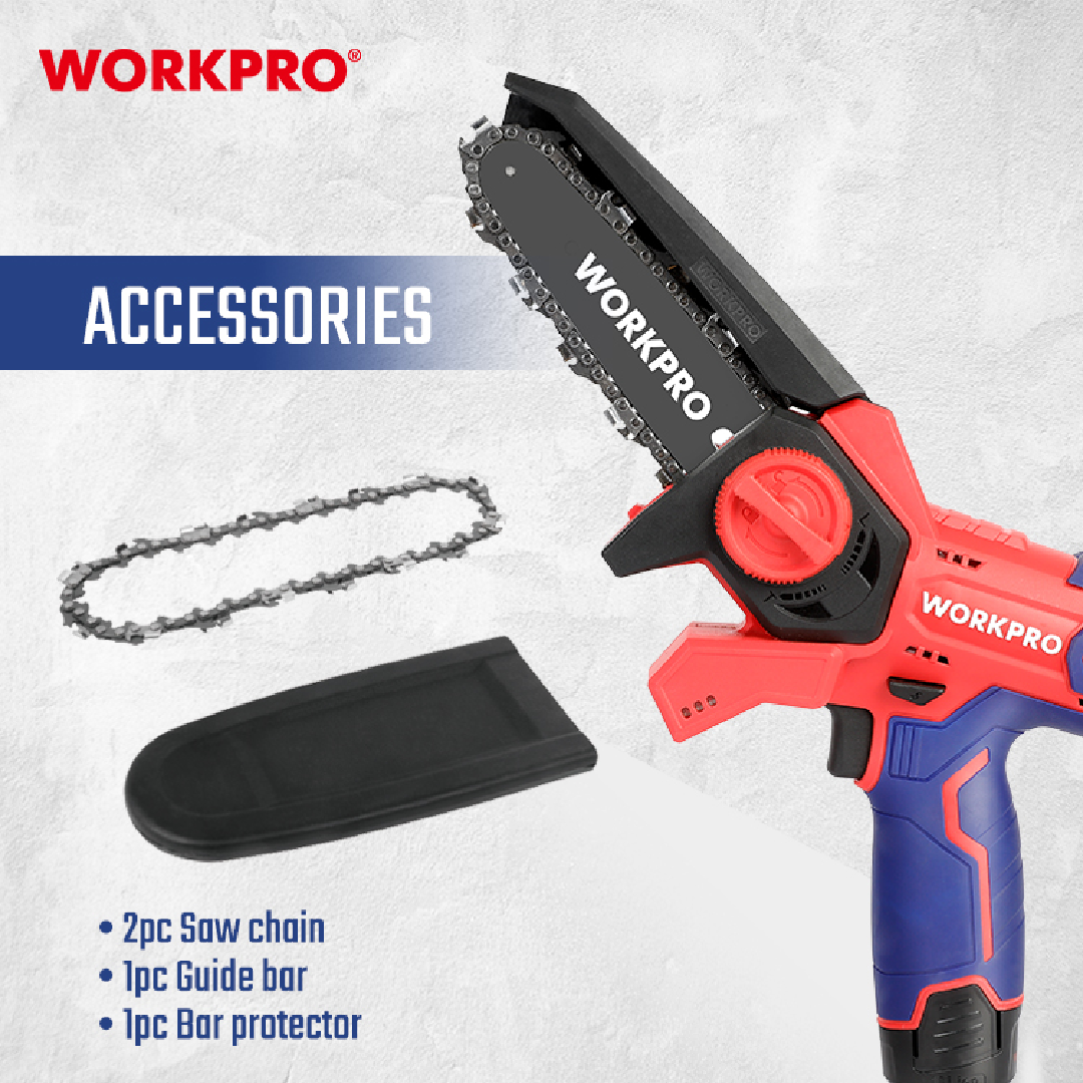 منشار شجر جنزير صغير محمول من WORKPRO — موديل WP461604 يعمل ببطارية 12V، مصمم لقص الأشجار الخفيفة، تقليم الفروع، والمهام السريعة في الحدائق. حجمه الصغير يجعله مثالي للاستخدام المنزلي، وسهل الحمل بيد واحدة.