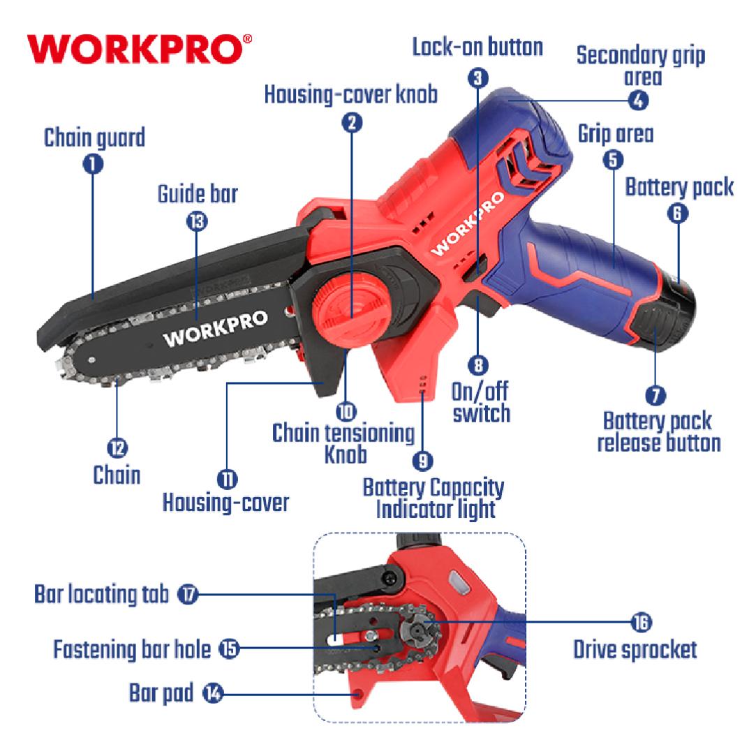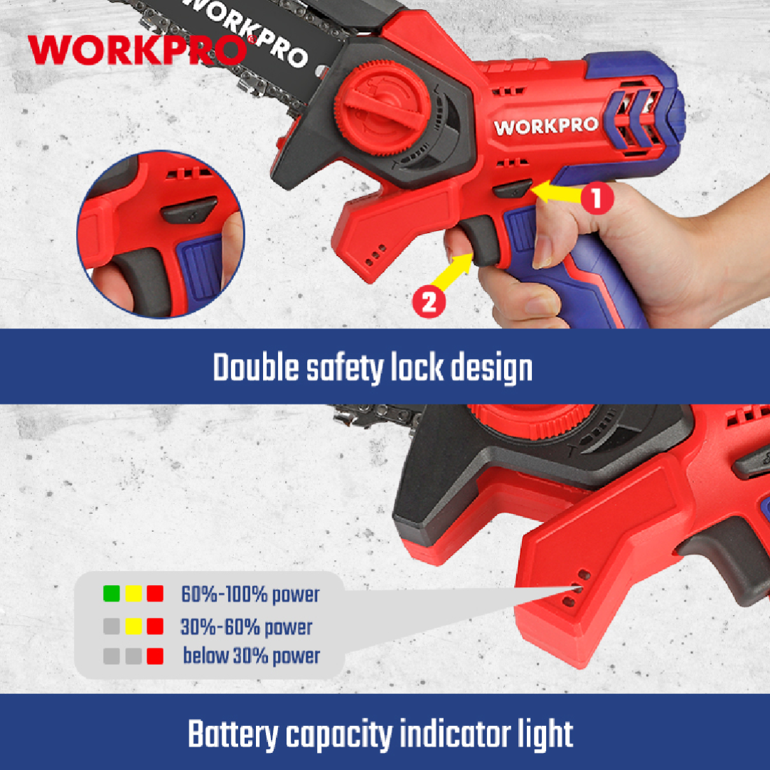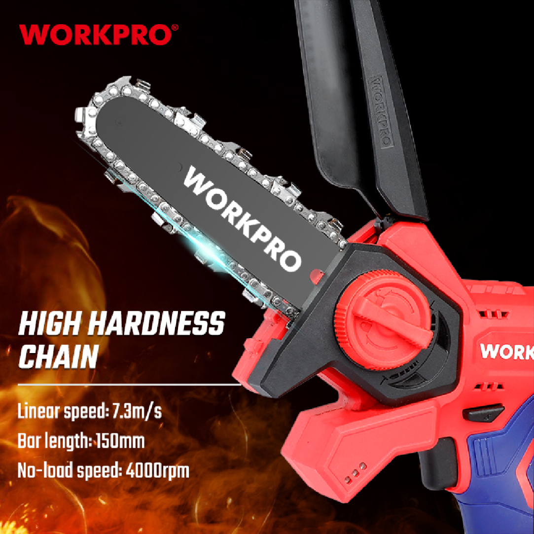 منشار شجر جنزير صغير محمول من WORKPRO — موديل WP461604 يعمل ببطارية 12V، مصمم لقص الأشجار الخفيفة، تقليم الفروع، والمهام السريعة في الحدائق. حجمه الصغير يجعله مثالي للاستخدام المنزلي، وسهل الحمل بيد واحدة.