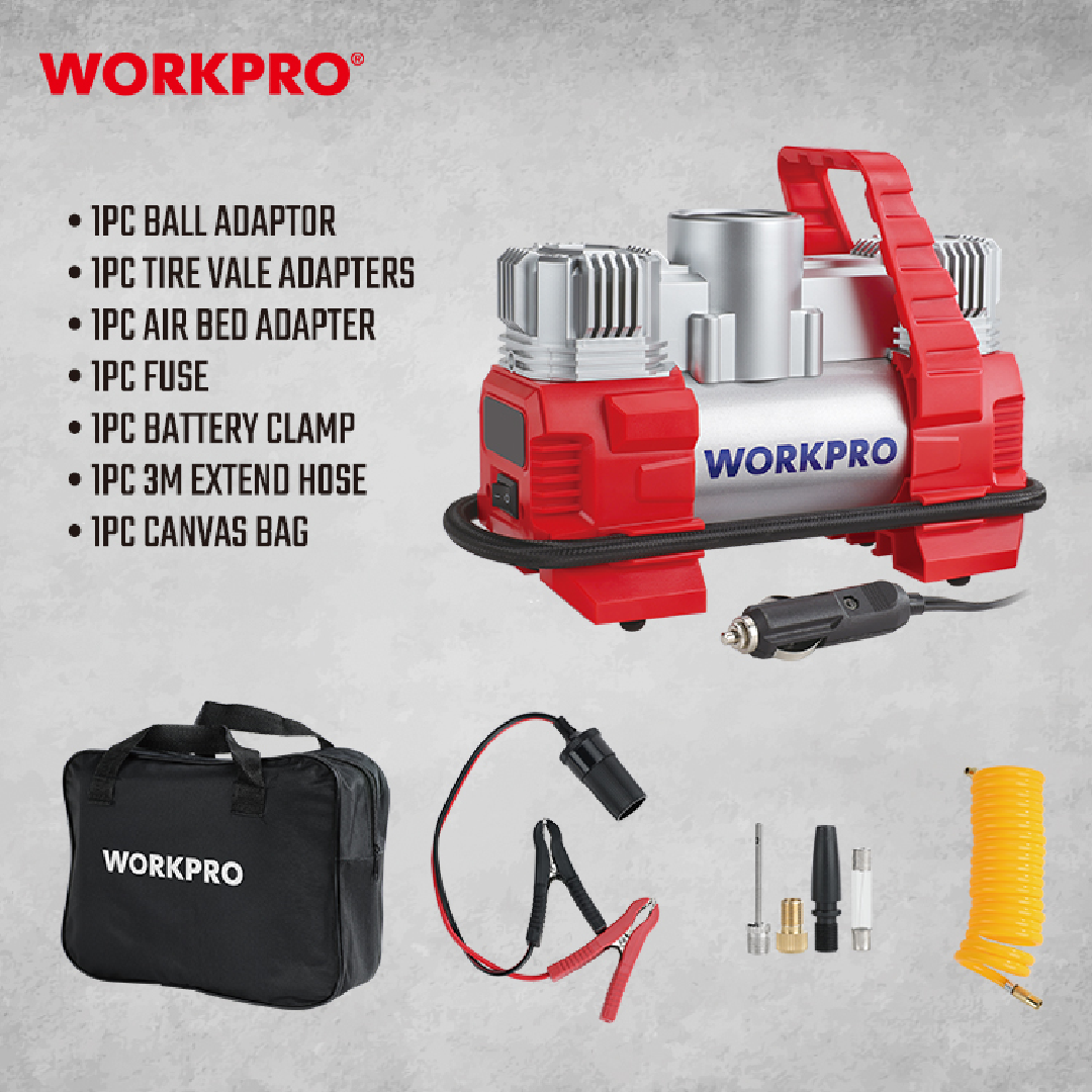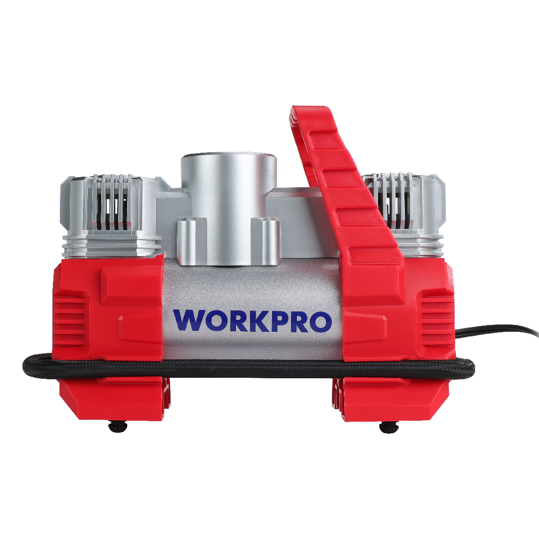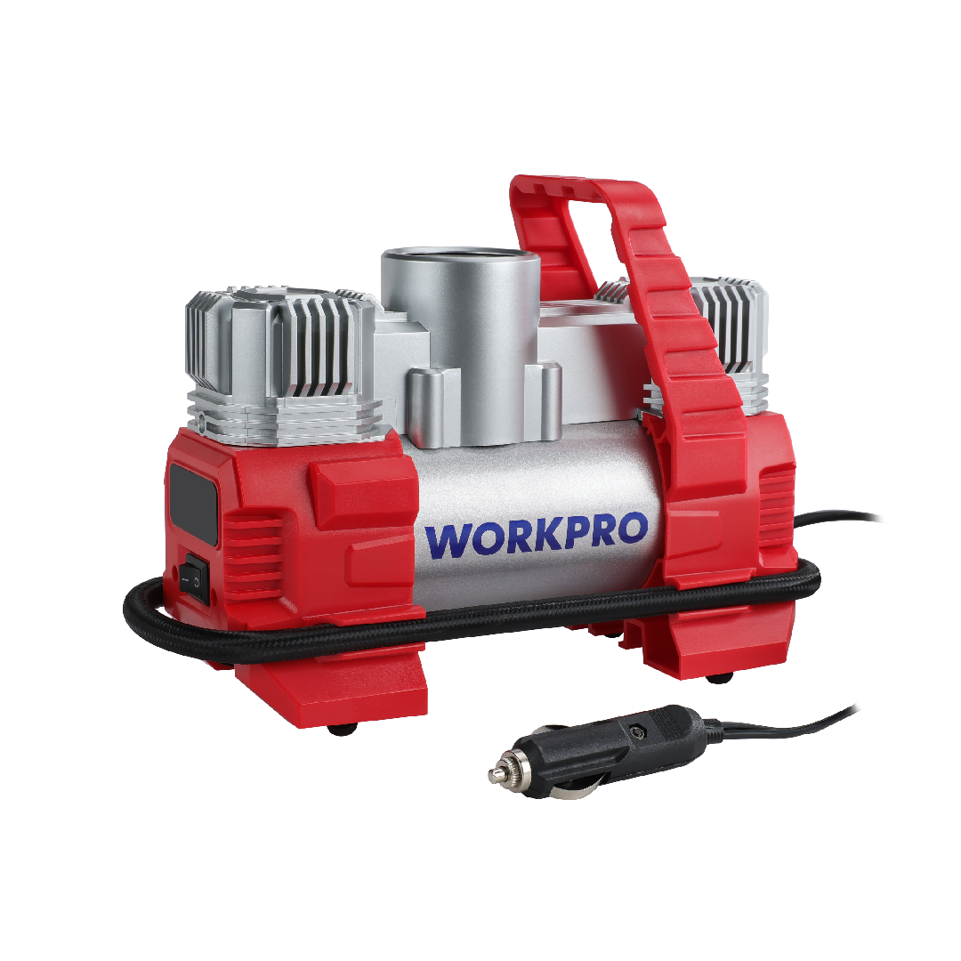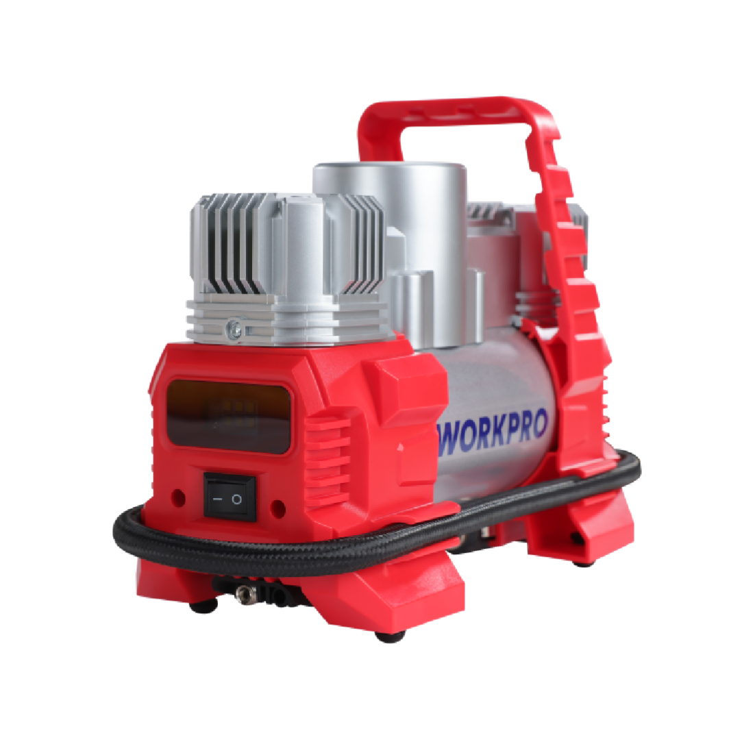 ضاغط هواء سيارة محمول من WORKPRO — موديل WP460801 بجهد تشغيل 12 V، مناسب لنفخ الإطارات بسرعة وسهولة أثناء التنقّل أو أثناء الاستخدام اليومي. تصميم عملي ومحمول يجعله خيار ممتاز للسيارات، الدراجات، والدراجات النارية.