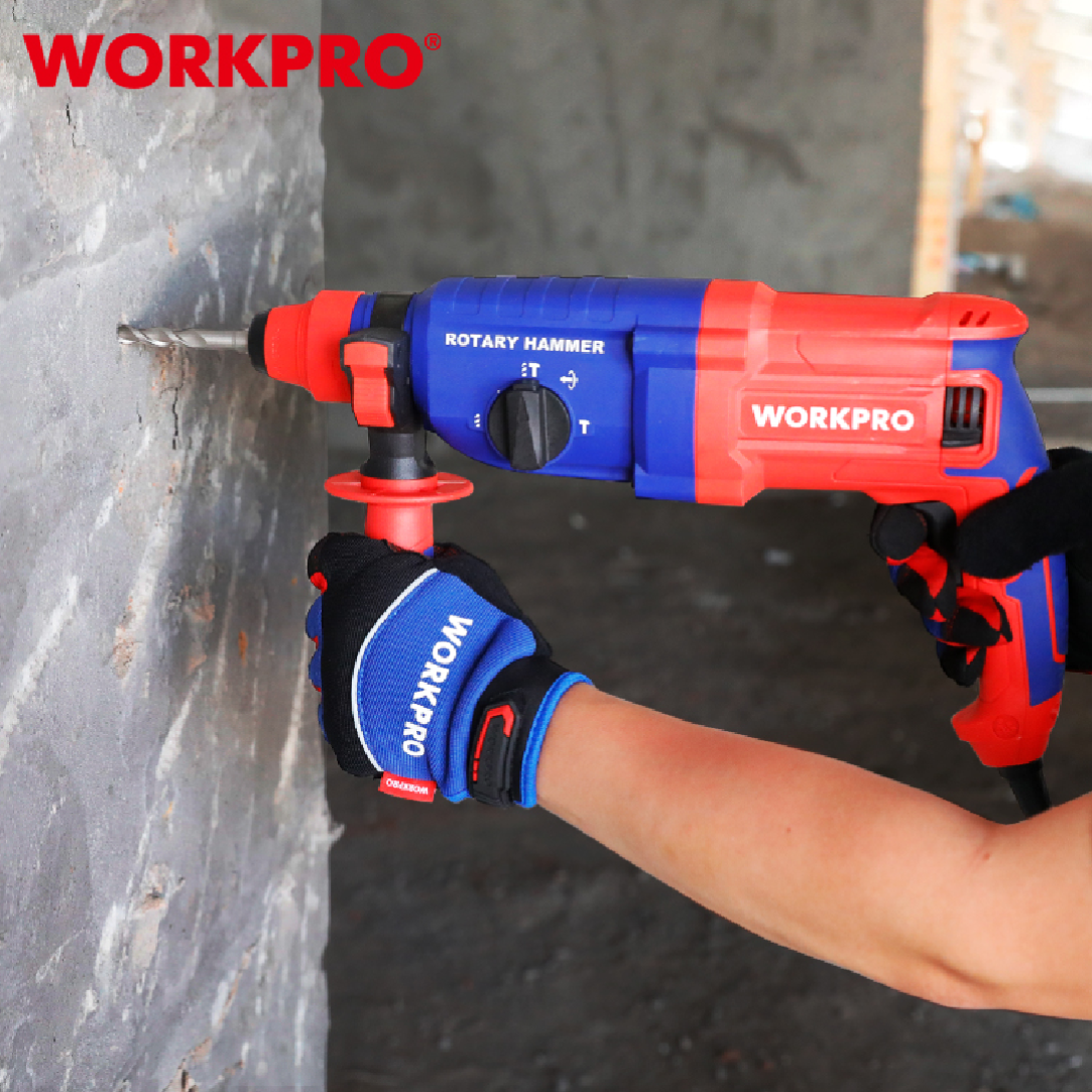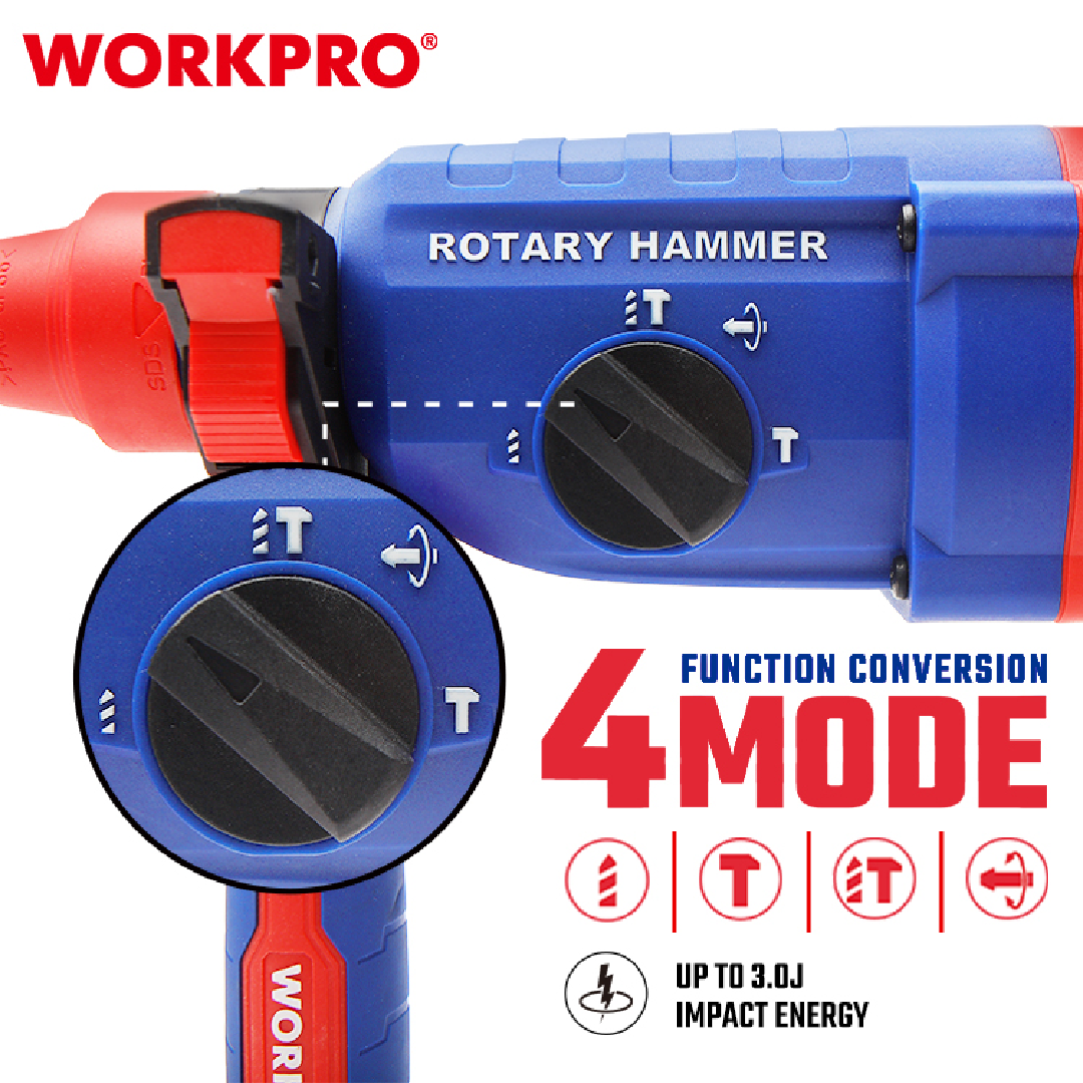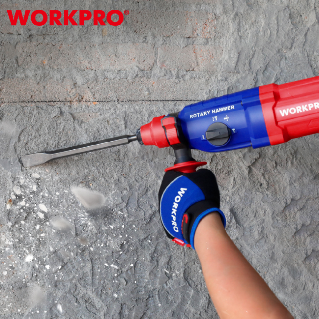 مطرقة دوارة احترافية من WORKPRO — موديل WP470400بنظام SDS-Plus وبقدرة حفر تصل إلى 26 مم. أداة مثالية لأعمال الحفر في الخرسانة، الطوب، الحجر، وللنحت أو الحفر في مواد البناء المختلفة.