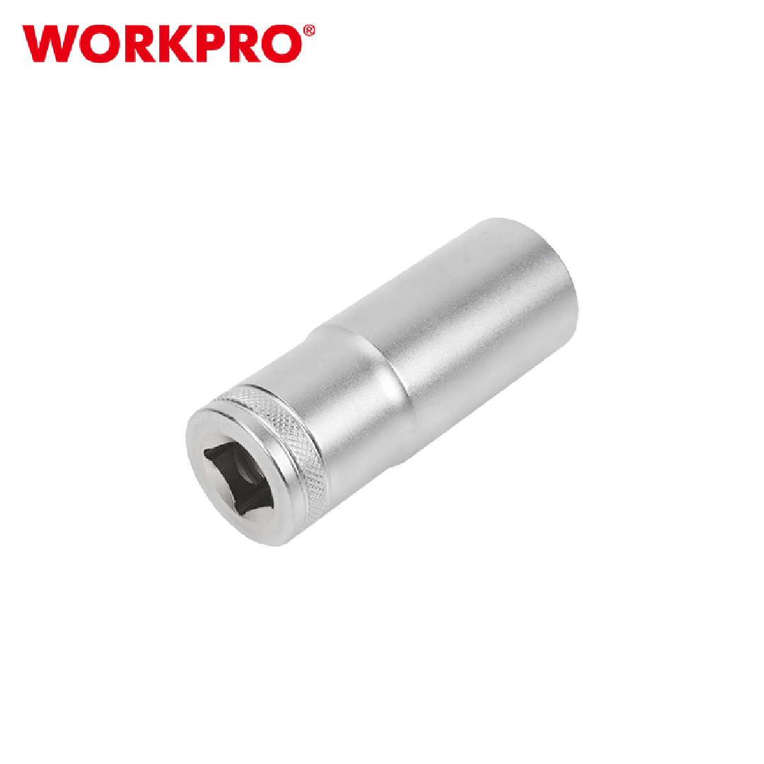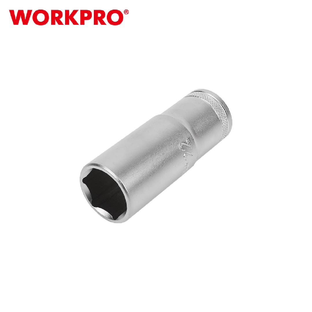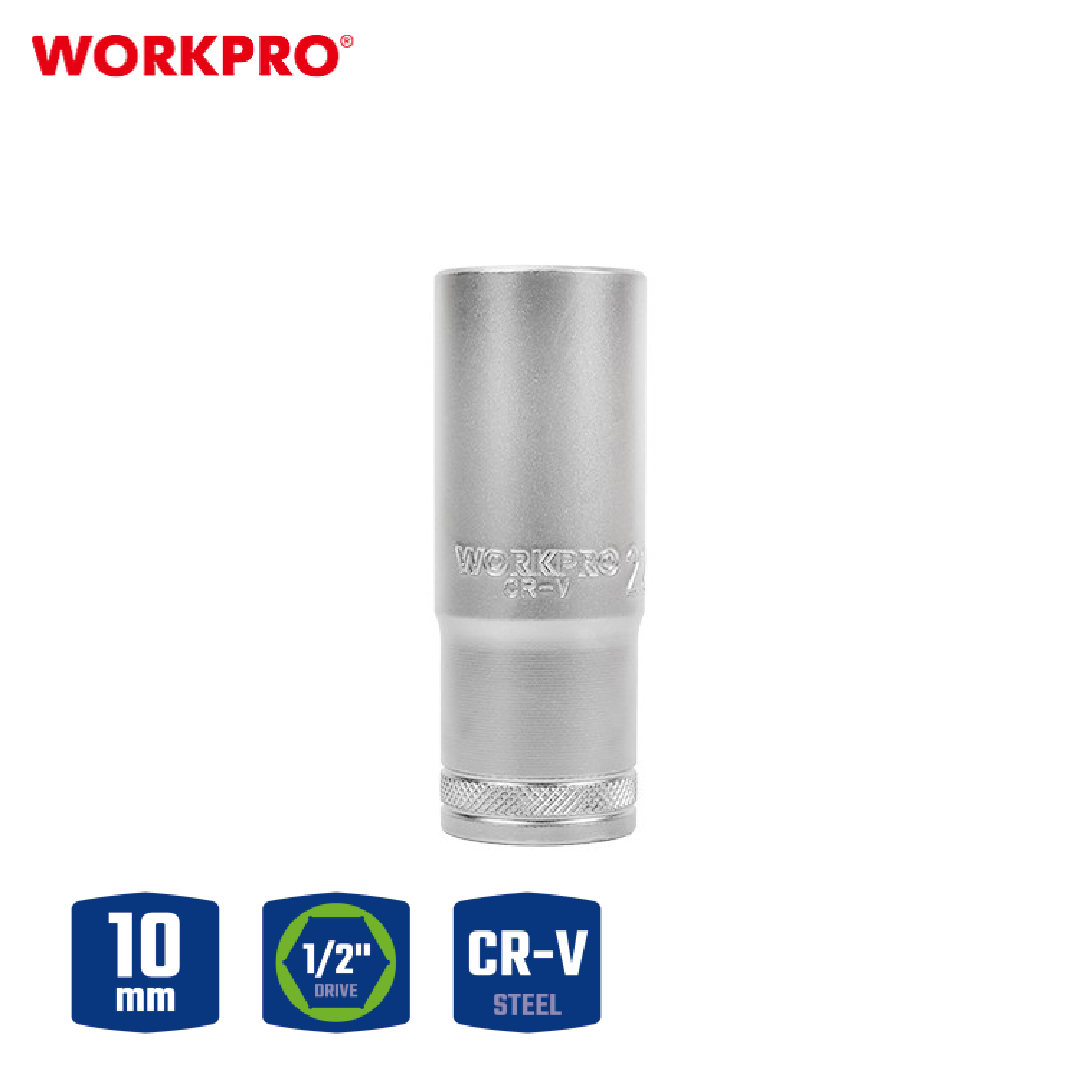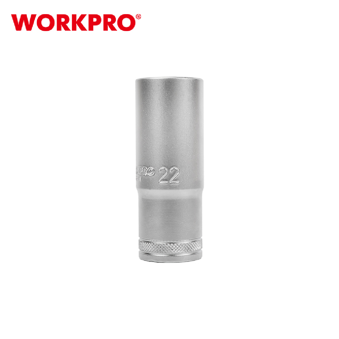 مقبس عميق من WORKPRO موديل WP274115، ضمن مجموعة Deep Socket مقاس 1/2 بوصة، مصمم للوصول إلى الصواميل والبراغي العميقة أو الغائرة. مصنوع من فولاذ كروم-فاناديوم (CR-V) مقوّى حرارياً لضمان متانة وتحمل طويل الأمد.