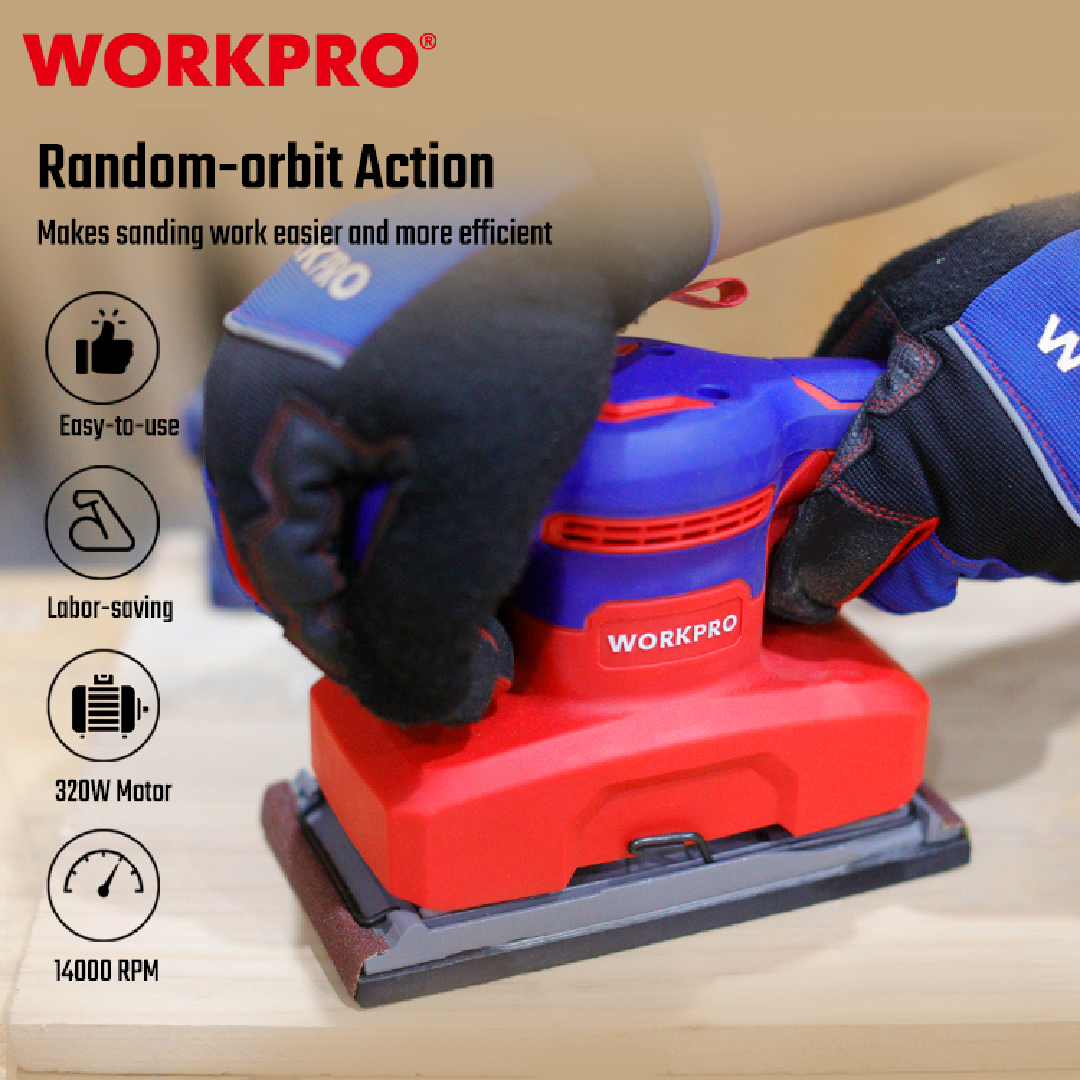 آلة صنفرة احترافية من WORKPRO — موديل WP472401 بمقاس 93×185 مم (1/3 ورقة)، مصممة لأعمال التشطيب النهائية وصنفرة الأسطح الخشبية بدقة عالية. تعمل بقدرة 320W وسرعة عالية تصل إلى 14000 دورة/دقيقة، ما يجعلها مثالية للنجارين، ورش الأثاث، وأعمال الترميم والدهان.