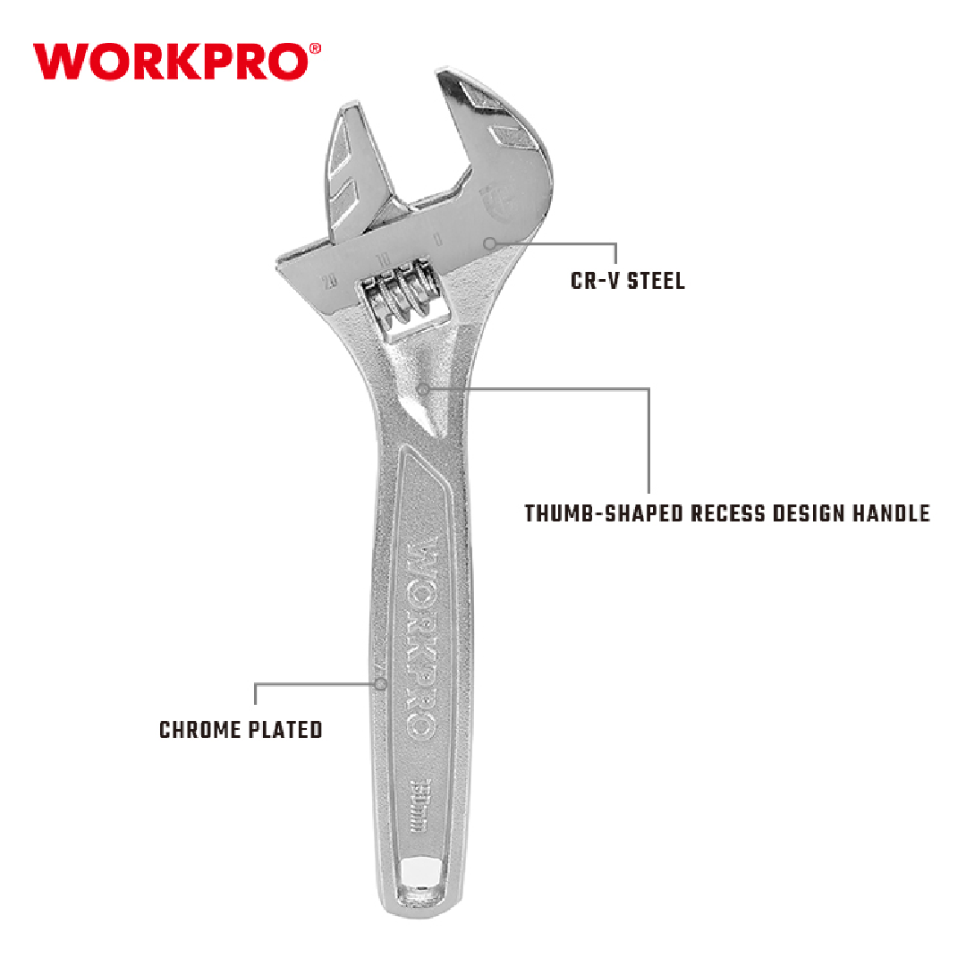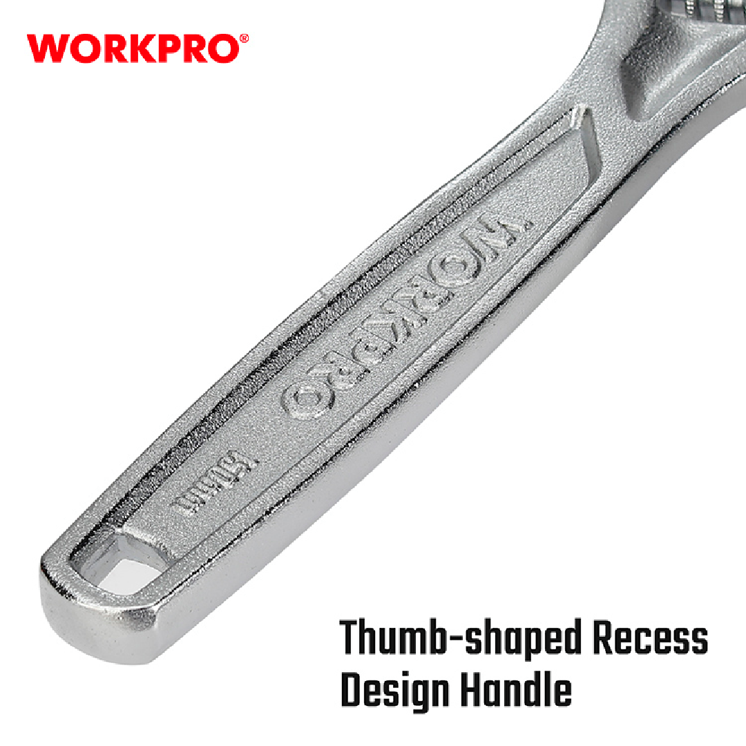 مفتاح فرنسي صناعي 6 انش 150 ملم من وورك برو WORKPRO WP272006 هو مفتاح قابل للتعديل مصمم لمهام ميكانيكية متنوعة، بما في ذلك إصلاحات السيارات والسباكة والصيانة العامة. مصنوع من فولاذ الكروم الفاناديوم المعالج بالحرارة (CR-V) لتعزيز القوة والمتانة، ويتميز بطبقة نهائية مطلية بالكروم لمقاومة الصدأ والتآكل. يسمح النقش الكبير بإجراء تعديلات سهلة، مما يضمن قبضة آمنة على أدوات التثبيت، بينما يوفر مقبض التصميم على شكل إبهام الراحة أثناء الاستخدام لفترات طويلة.