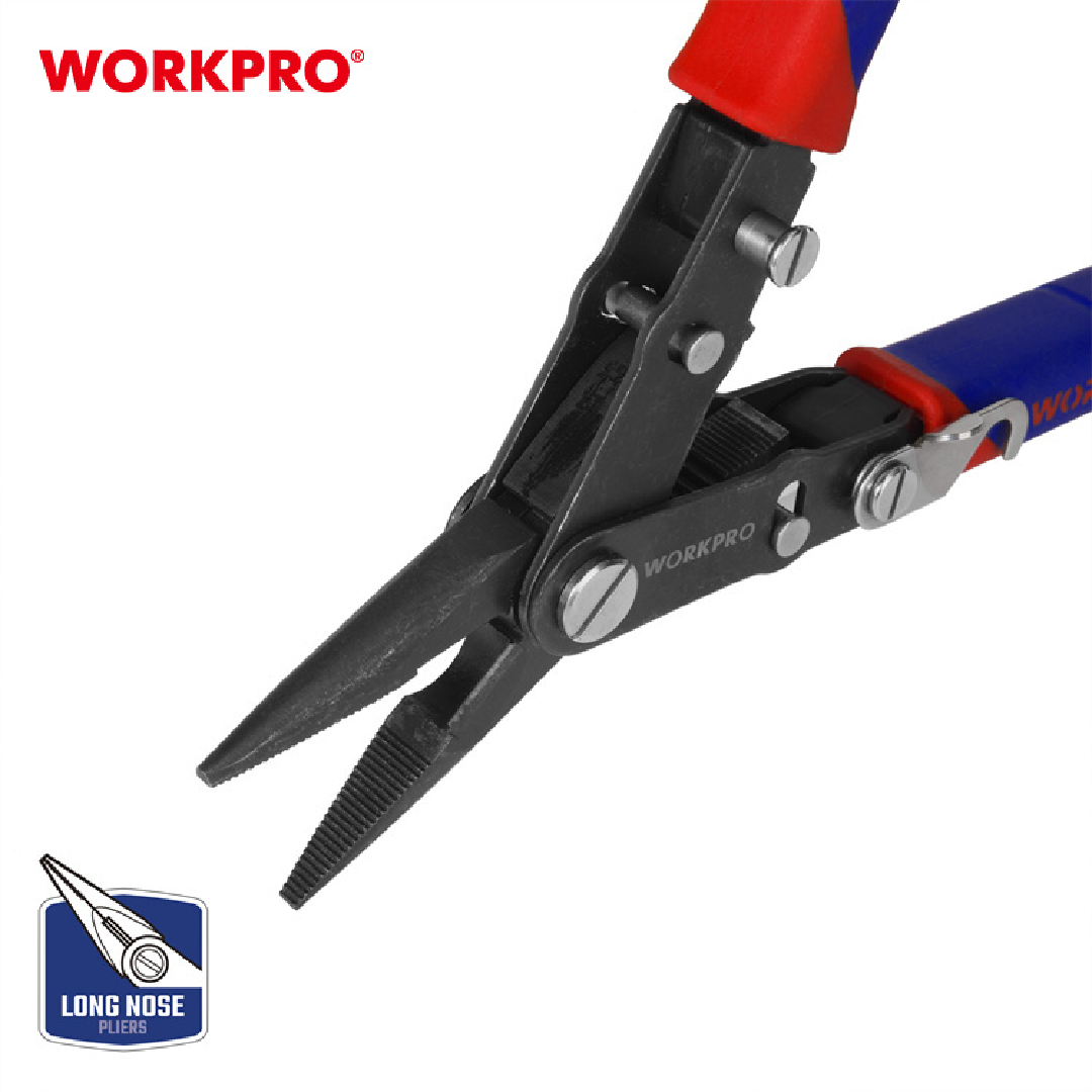 زرادية 2 في 1 قلاب من ووركبرو Workpro WP231084 وظائف كماشة المفصل المنزلق وكماشة الأنف الطويلة في أداة واحدة مقاس 8 إنش (200 مم). صُممت هذه الكماشة لتكون متعددة الاستخدامات، وهي مناسبة لمهام مختلفة، بما في ذلك الإمساك والانحناء والقطع. صُنعت هذه الكماشة من فولاذ عالي الجودة، وهي معالجة بالحرارة لتعزيز المتانة وتتميز بمقابض مريحة لراحة المستخدم. تسهل الفكين المحملين بنابض سهولة الاستخدام أثناء المهام المتكررة.
